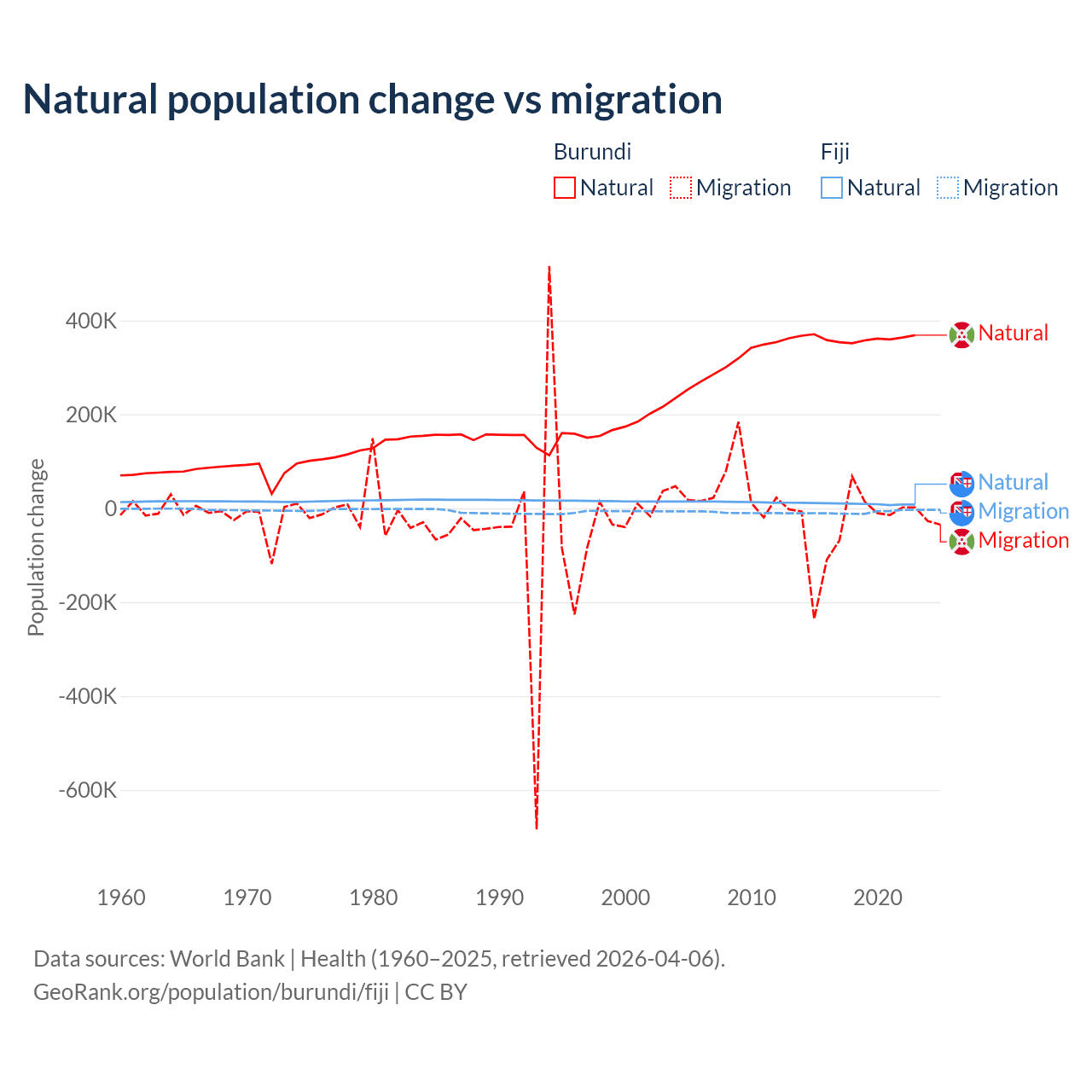 Over the last 10 years, 91% of the population change in Burundi is from natural causes (a gain of 3,614,502 people) and 9.03% is from migration (a loss of 358,928 people). In Fiji 52.6% is from natural causes (a gain of 94,971 people) and 47.4% is from migration (a loss of 85,415 people).