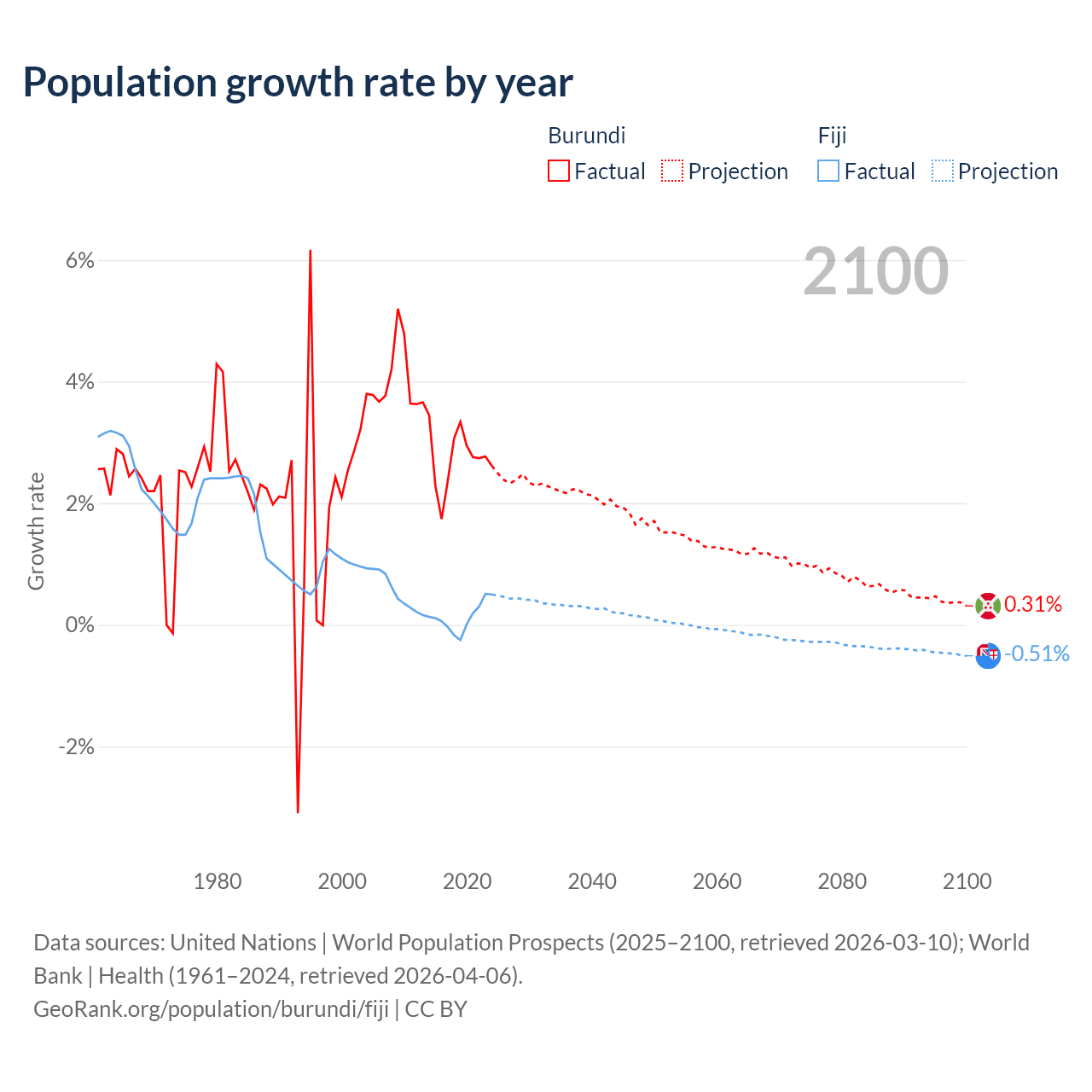 - For the last 10 years, Burundi has had an average growth rate of +2.74% per year vs +0.12% in Fiji.
