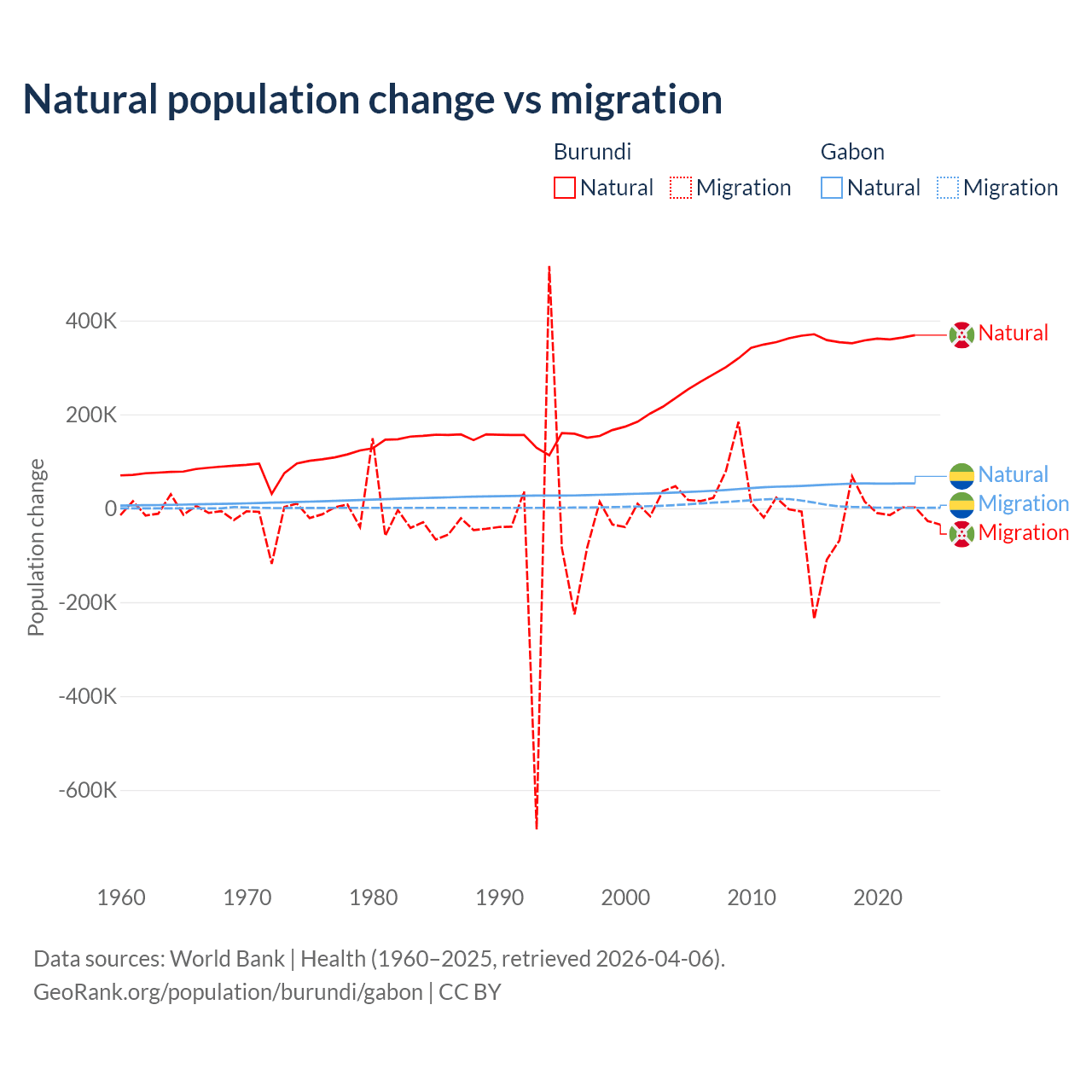 Over the last 10 years, 91% of the population change in Burundi is from natural causes (a gain of 3,614,502 people) and 9.03% is from migration (a loss of 358,928 people). In Gabon 91.1% is from natural causes (a gain of 515,484 people) and 8.86% is from migration (a gain of 50,119 people).