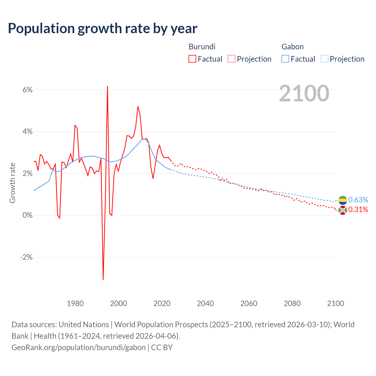 - For the last 10 years, Burundi has had an average growth rate of +2.74% per year vs +2.61% in Gabon.