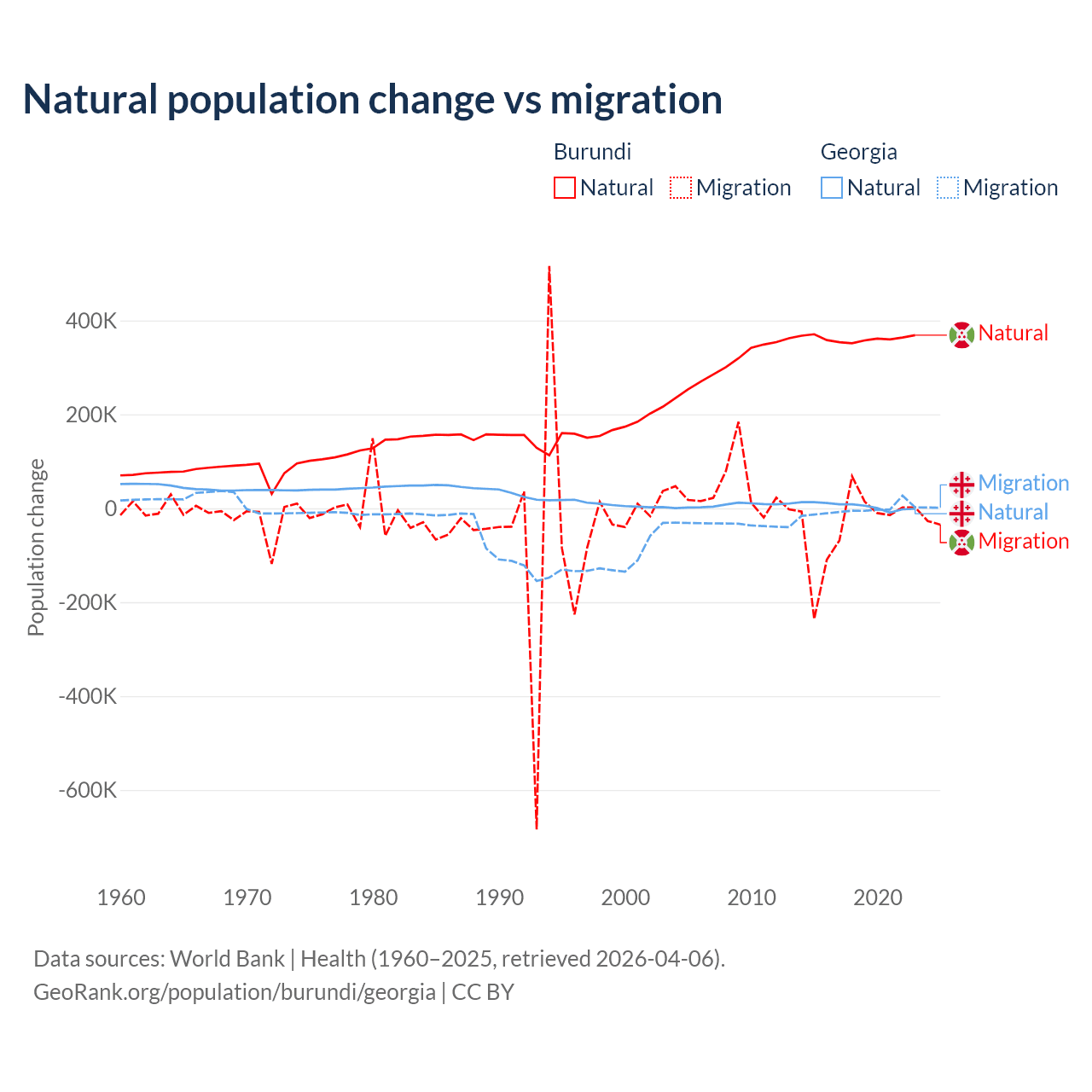 Over the last 10 years, 91% of the population change in Burundi is from natural causes (a gain of 3,614,502 people) and 9.03% is from migration (a loss of 358,928 people). In Georgia 57.7% is from natural causes (a gain of 47,646 people) and 42.3% is from migration (a loss of 34,907 people).