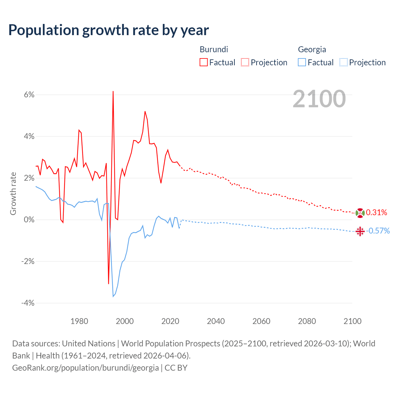 - For the last 10 years, Burundi has had an average growth rate of +2.74% per year vs -0.04% in Georgia.