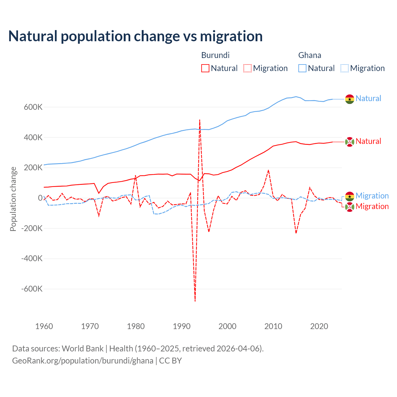 Over the last 10 years, 91% of the population change in Burundi is from natural causes (a gain of 3,614,502 people) and 9.03% is from migration (a loss of 358,928 people). In Ghana 98.6% is from natural causes (a gain of 6,484,449 people) and 1.37% is from migration (a loss of 90,310 people).
