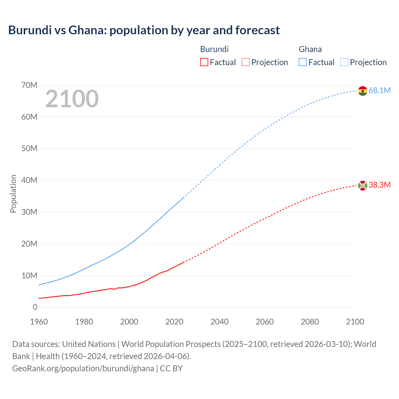Burundi vs Ghana: population by year and forecast