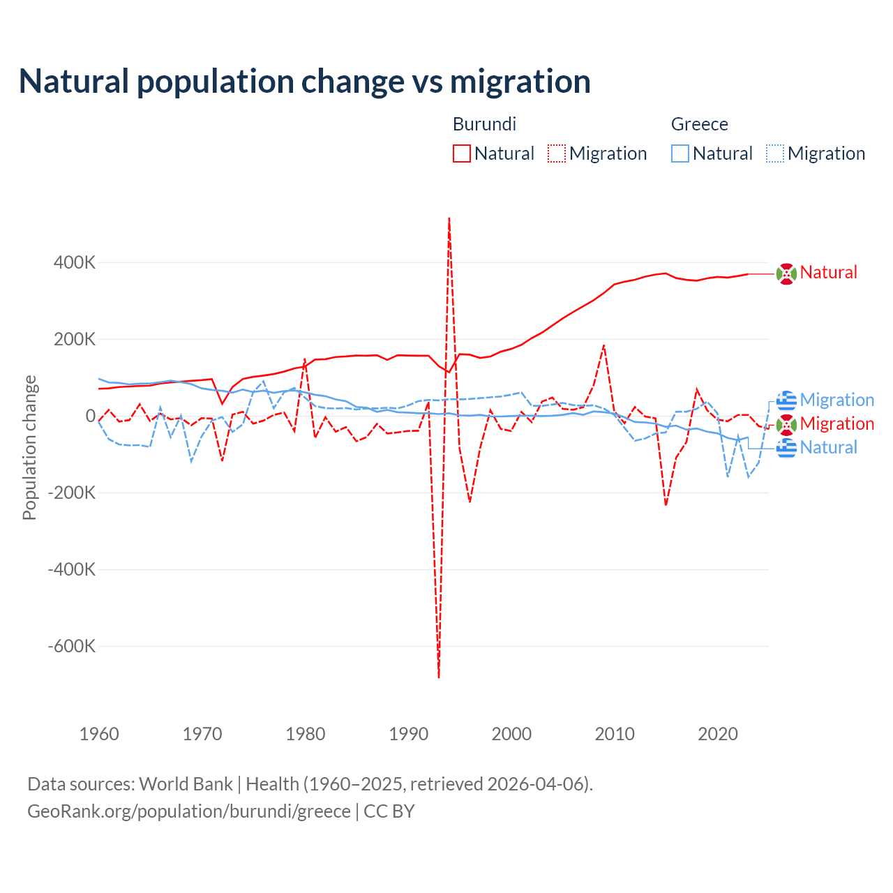 Over the last 10 years, 91% of the population change in Burundi is from natural causes (a gain of 3,614,502 people) and 9.03% is from migration (a loss of 358,928 people). In Greece 51.9% is from natural causes (a loss of 411,426 people) and 48.1% is from migration (a loss of 381,824 people).