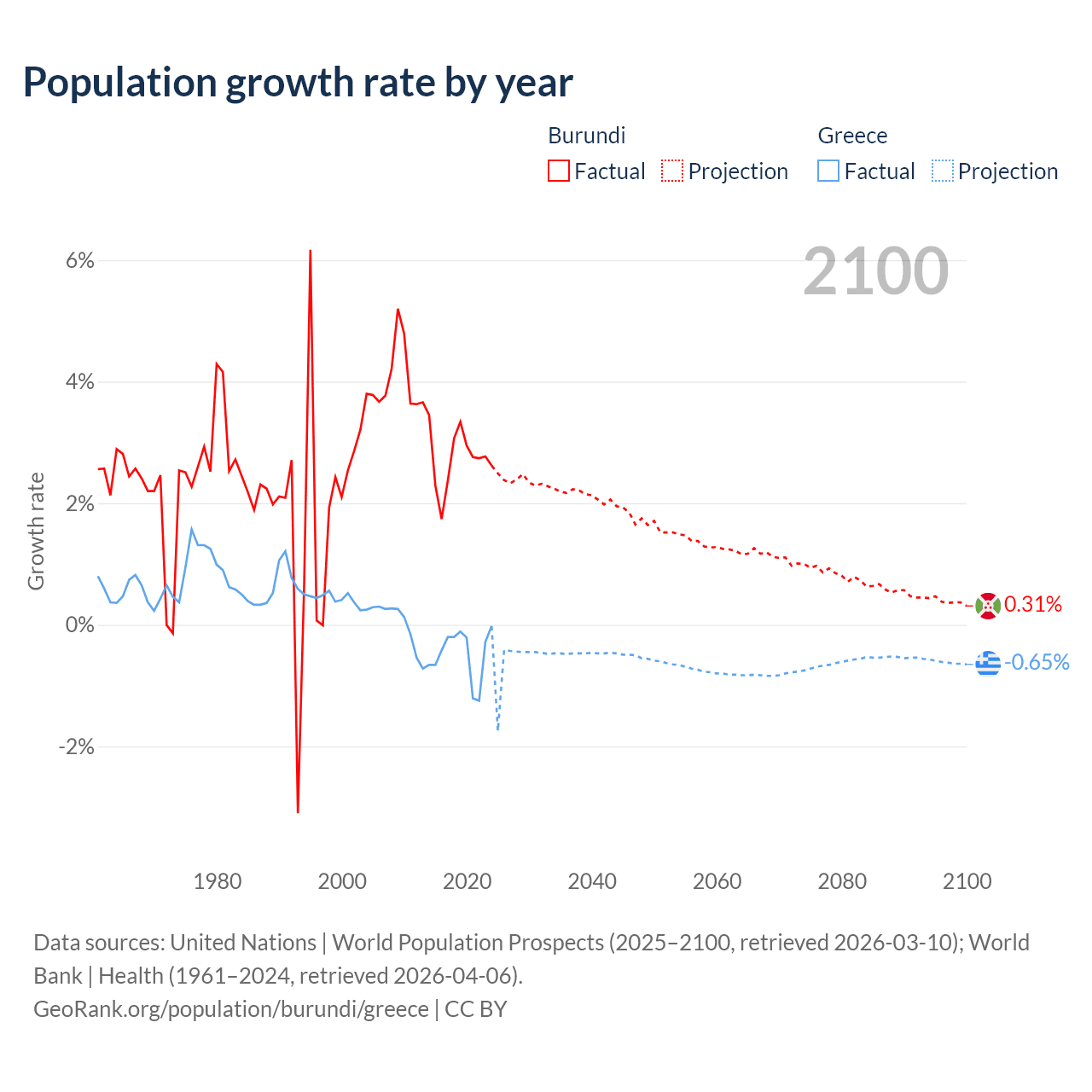 - For the last 10 years, Burundi has had an average growth rate of +2.74% per year vs -0.47% in Greece.