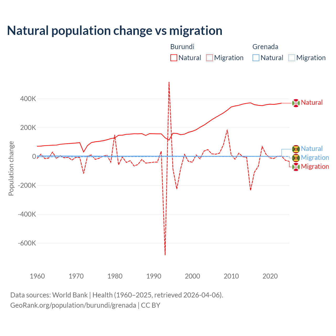 Over the last 10 years, 91% of the population change in Burundi is from natural causes (a gain of 3,614,502 people) and 9.03% is from migration (a loss of 358,928 people). In Grenada 76% is from natural causes (a gain of 4,850 people) and 24% is from migration (a loss of 1,535 people).