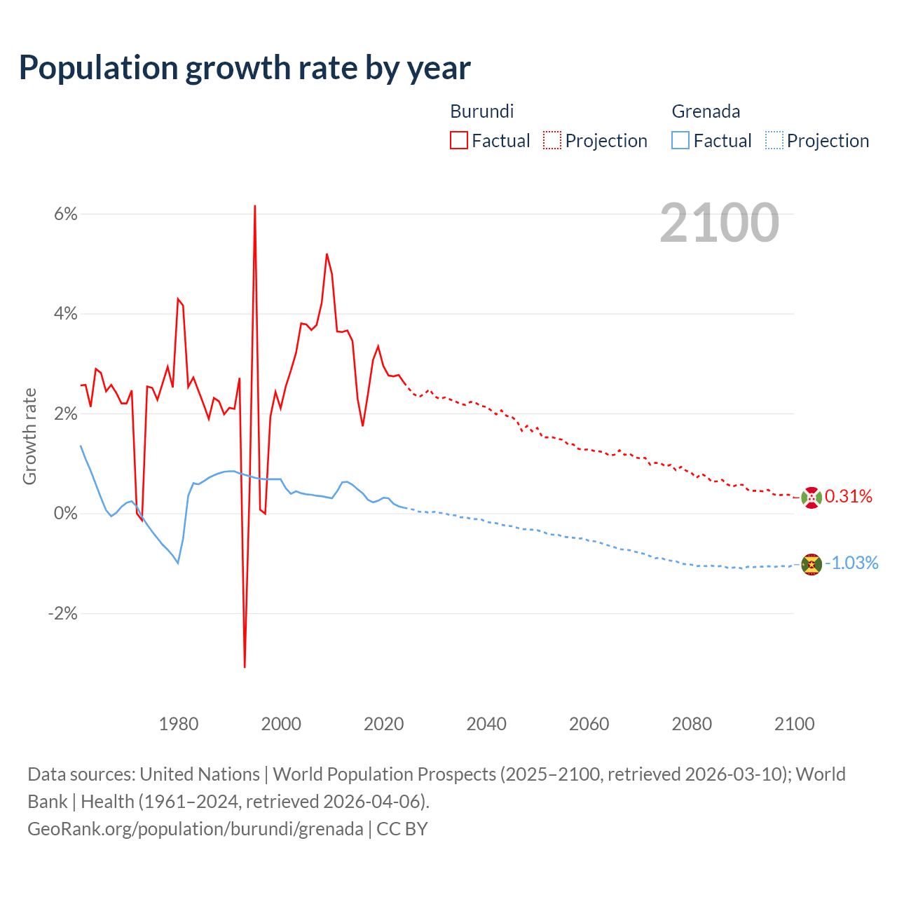 - For the last 10 years, Burundi has had an average growth rate of +2.74% per year vs +0.29% in Grenada.