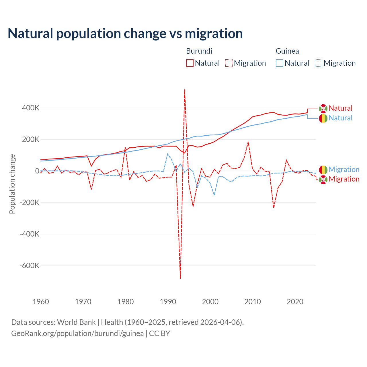 Over the last 10 years, 91% of the population change in Burundi is from natural causes (a gain of 3,614,502 people) and 9.03% is from migration (a loss of 358,928 people). In Guinea 97.2% is from natural causes (a gain of 3,346,936 people) and 2.76% is from migration (a loss of 94,924 people).