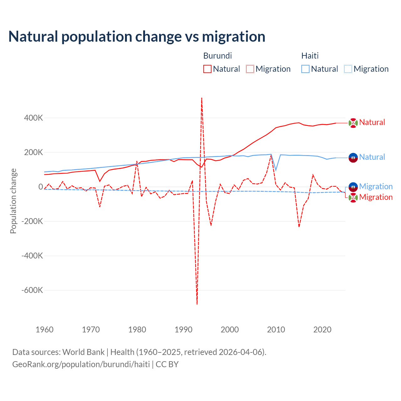 Over the last 10 years, 91% of the population change in Burundi is from natural causes (a gain of 3,614,502 people) and 9.03% is from migration (a loss of 358,928 people). In Haiti 83.9% is from natural causes (a gain of 1,740,319 people) and 16.1% is from migration (a loss of 333,076 people).