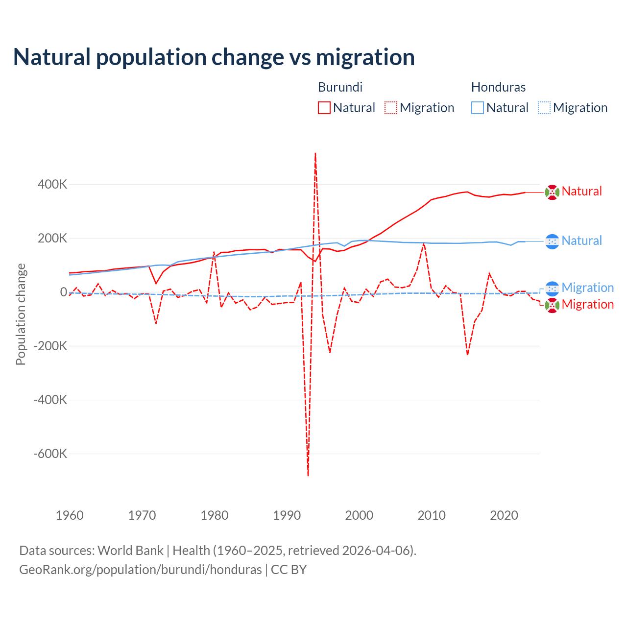 Over the last 10 years, 91% of the population change in Burundi is from natural causes (a gain of 3,614,502 people) and 9.03% is from migration (a loss of 358,928 people). In Honduras 96.7% is from natural causes (a gain of 1,821,125 people) and 3.29% is from migration (a loss of 61,965 people).