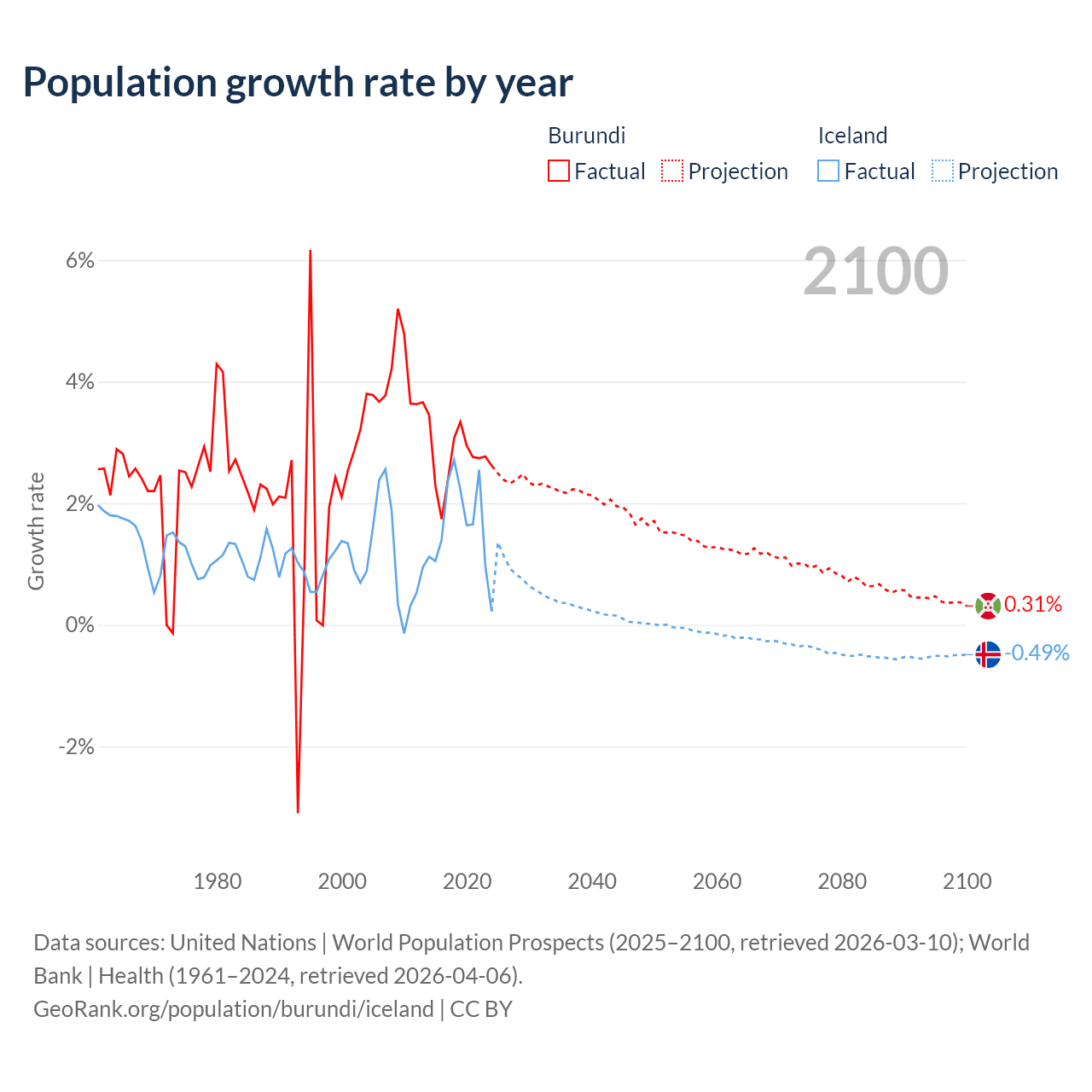 - For the last 10 years, Burundi has had an average growth rate of +2.74% per year vs +1.63% in Iceland.