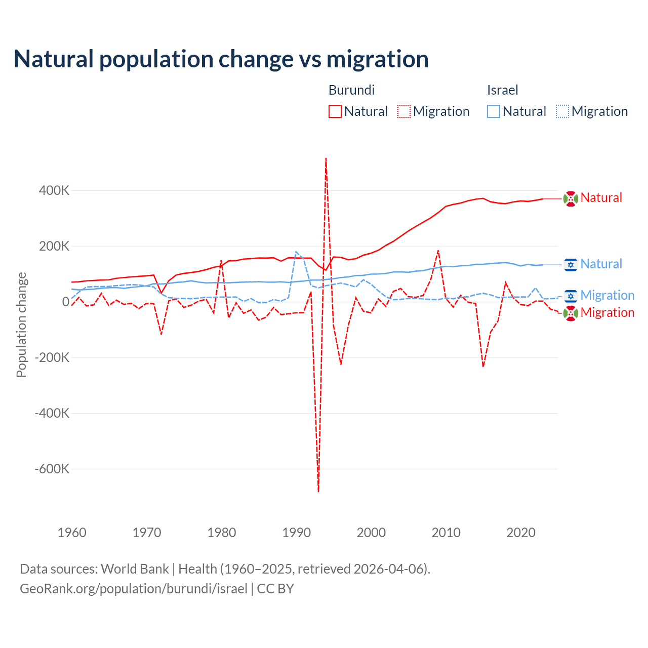 Over the last 10 years, 91% of the population change in Burundi is from natural causes (a gain of 3,614,502 people) and 9.03% is from migration (a loss of 358,928 people). In Israel 86% is from natural causes (a gain of 1,343,492 people) and 14% is from migration (a gain of 219,048 people).