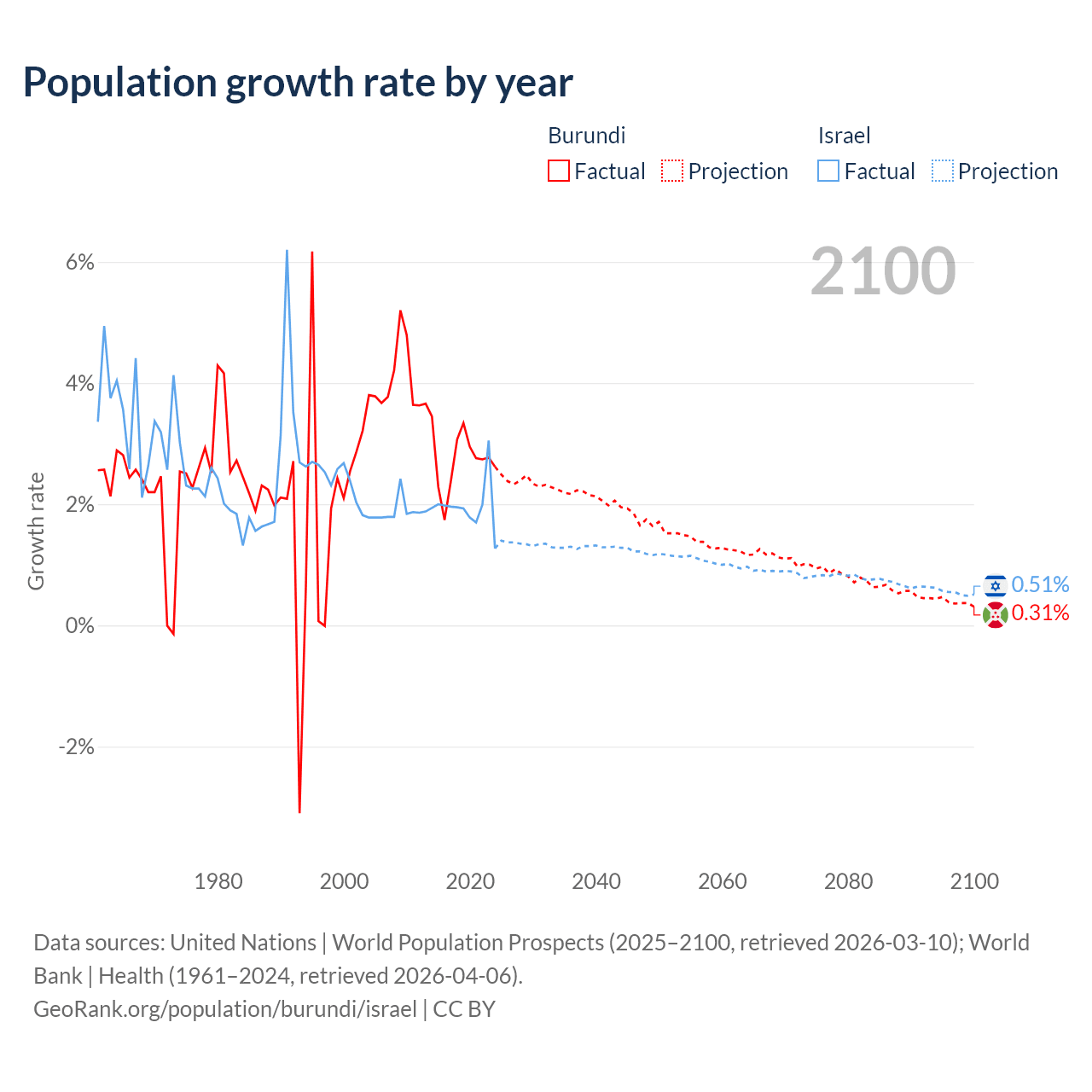 - For the last 10 years, Burundi has had an average growth rate of +2.74% per year vs +1.96% in Israel.