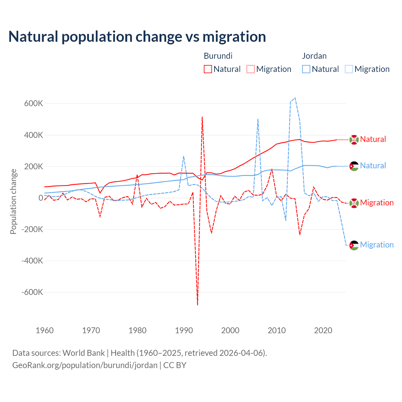 Over the last 10 years, 91% of the population change in Burundi is from natural causes (a gain of 3,614,502 people) and 9.03% is from migration (a loss of 358,928 people). In Jordan 63.2% is from natural causes (a gain of 1,991,452 people) and 36.8% is from migration (a gain of 1,157,625 people).