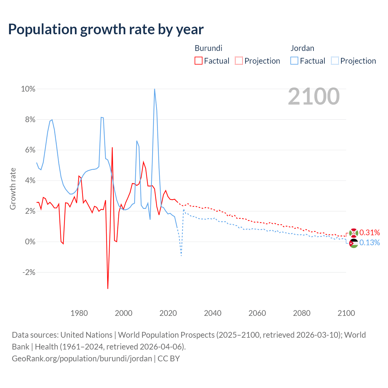 - For the last 10 years, Burundi has had an average growth rate of +2.74% per year vs +3.45% in Jordan.