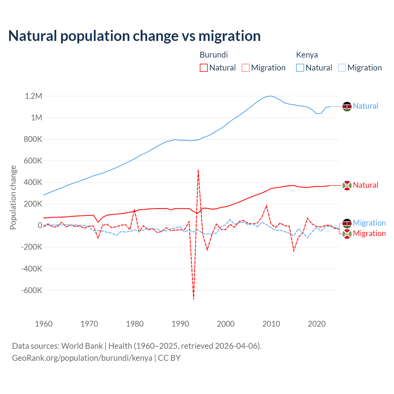 Over the last 10 years, 91% of the population change in Burundi is from natural causes (a gain of 3,614,502 people) and 9.03% is from migration (a loss of 358,928 people). In Kenya 95.3% is from natural causes (a gain of 10,892,362 people) and 4.67% is from migration (a loss of 533,876 people).