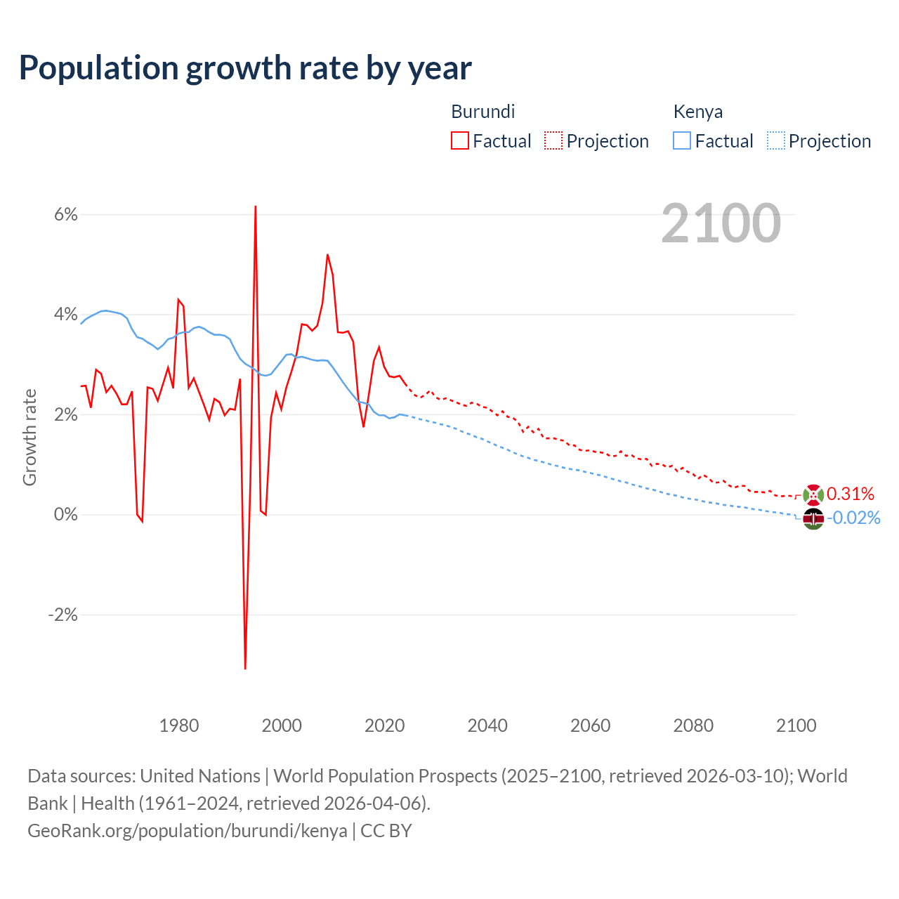 - For the last 10 years, Burundi has had an average growth rate of +2.74% per year vs +2.08% in Kenya.