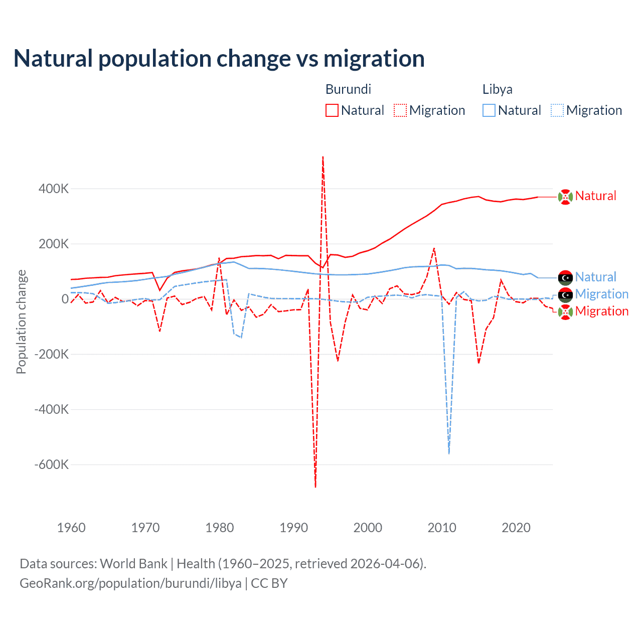 Over the last 10 years, 91% of the population change in Burundi is from natural causes (a gain of 3,614,502 people) and 9.03% is from migration (a loss of 358,928 people). In Libya 99.4% is from natural causes (a gain of 975,799 people) and 0.63% is from migration (a loss of 6,150 people).