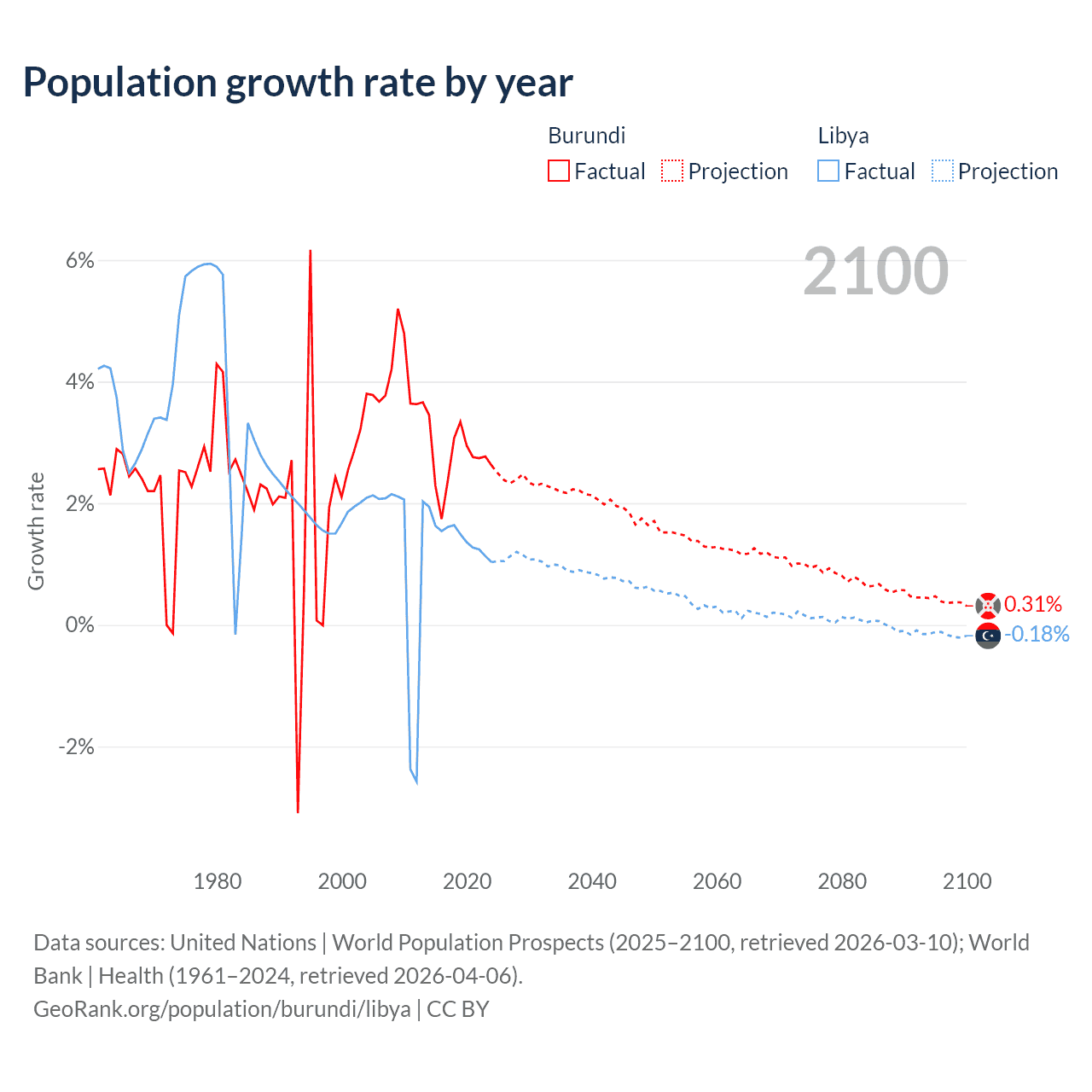 - For the last 10 years, Burundi has had an average growth rate of +2.74% per year vs +1.44% in Libya.