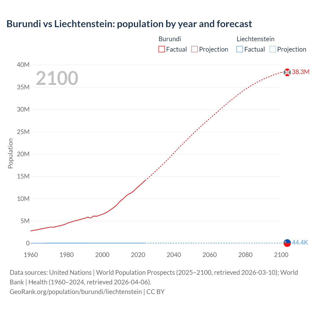 The latest officially reported population of Burundi was 14,047,786 in 2024 vs 40,450 people in Liechtenstein in 2024. In 2026, based on the adjusted UN estimation, the current Burundi's population is 14,833,763 people compared to 41,038 in Liechtenstein.