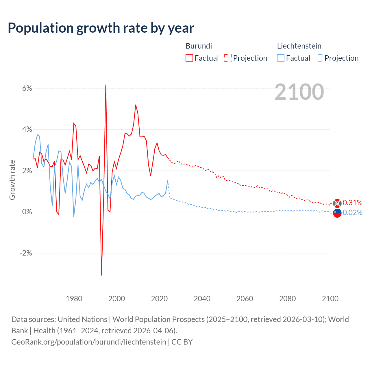 - For the last 10 years, Burundi has had an average growth rate of +2.74% per year vs +0.82% in Liechtenstein.