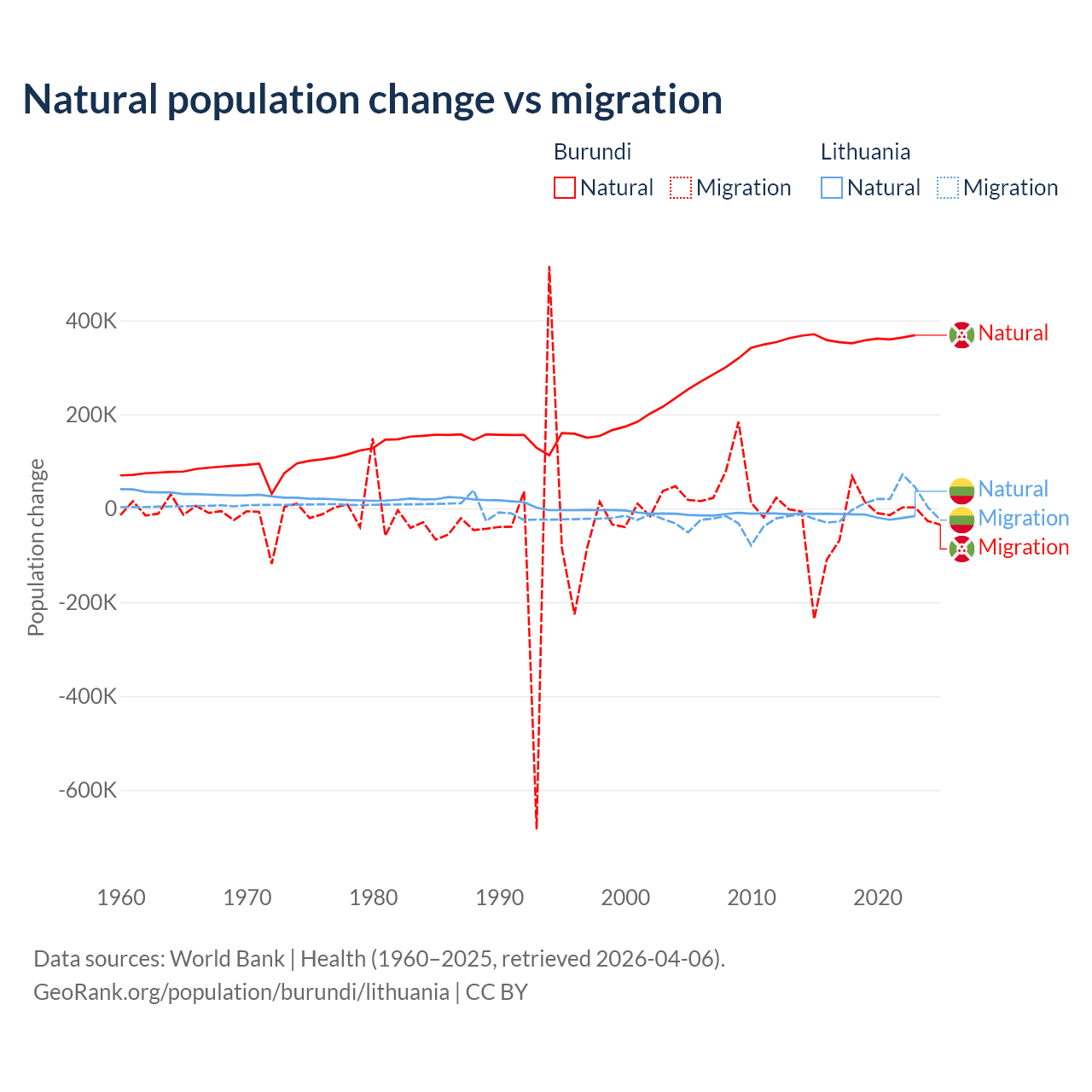 Over the last 10 years, 91% of the population change in Burundi is from natural causes (a gain of 3,614,502 people) and 9.03% is from migration (a loss of 358,928 people). In Lithuania 68.7% is from natural causes (a loss of 153,859 people) and 31.3% is from migration (a gain of 70,196 people).