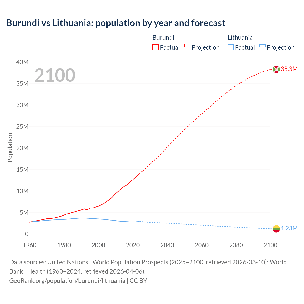 Burundi vs Lithuania: population by year and forecast