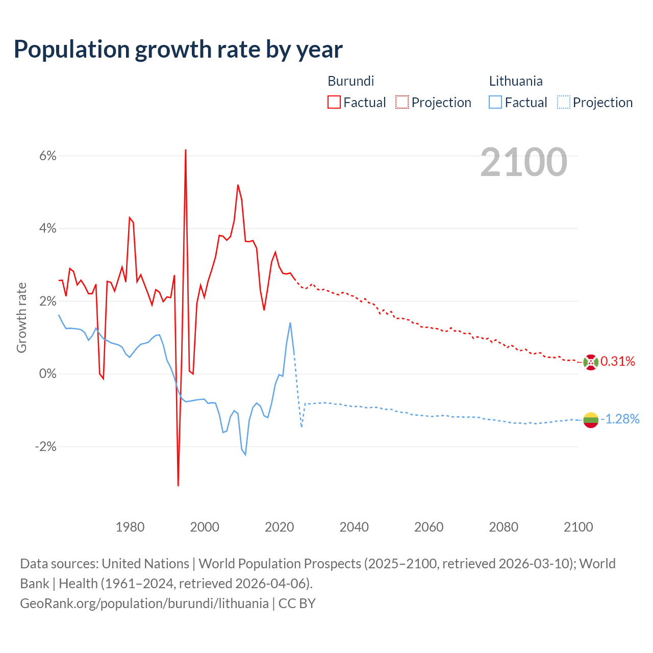 - For the last 10 years, Burundi has had an average growth rate of +2.74% per year vs -0.22% in Lithuania.