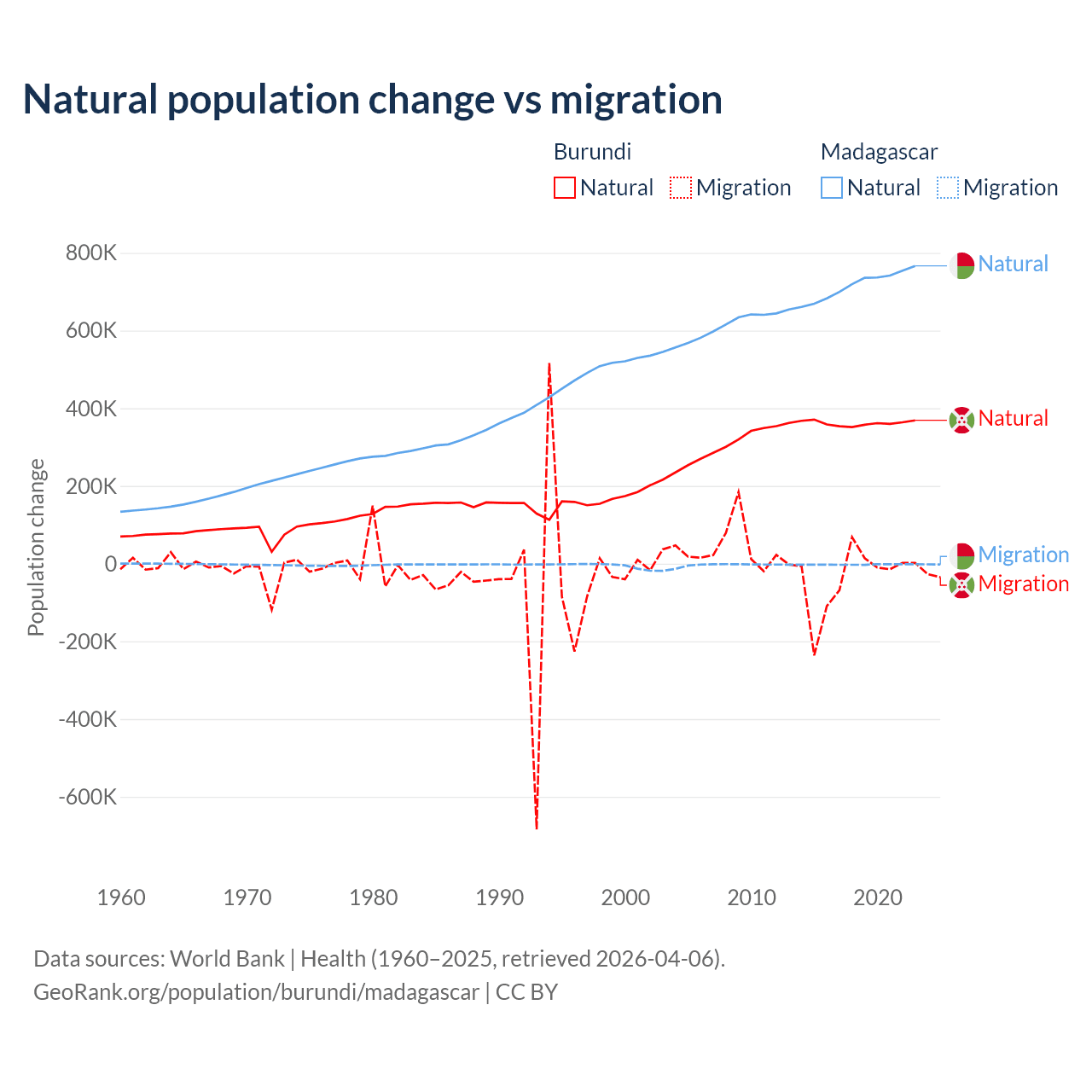 Over the last 10 years, 91% of the population change in Burundi is from natural causes (a gain of 3,614,502 people) and 9.03% is from migration (a loss of 358,928 people). In Madagascar 99.7% is from natural causes (a gain of 7,165,578 people) and 0.31% is from migration (a loss of 22,384 people).