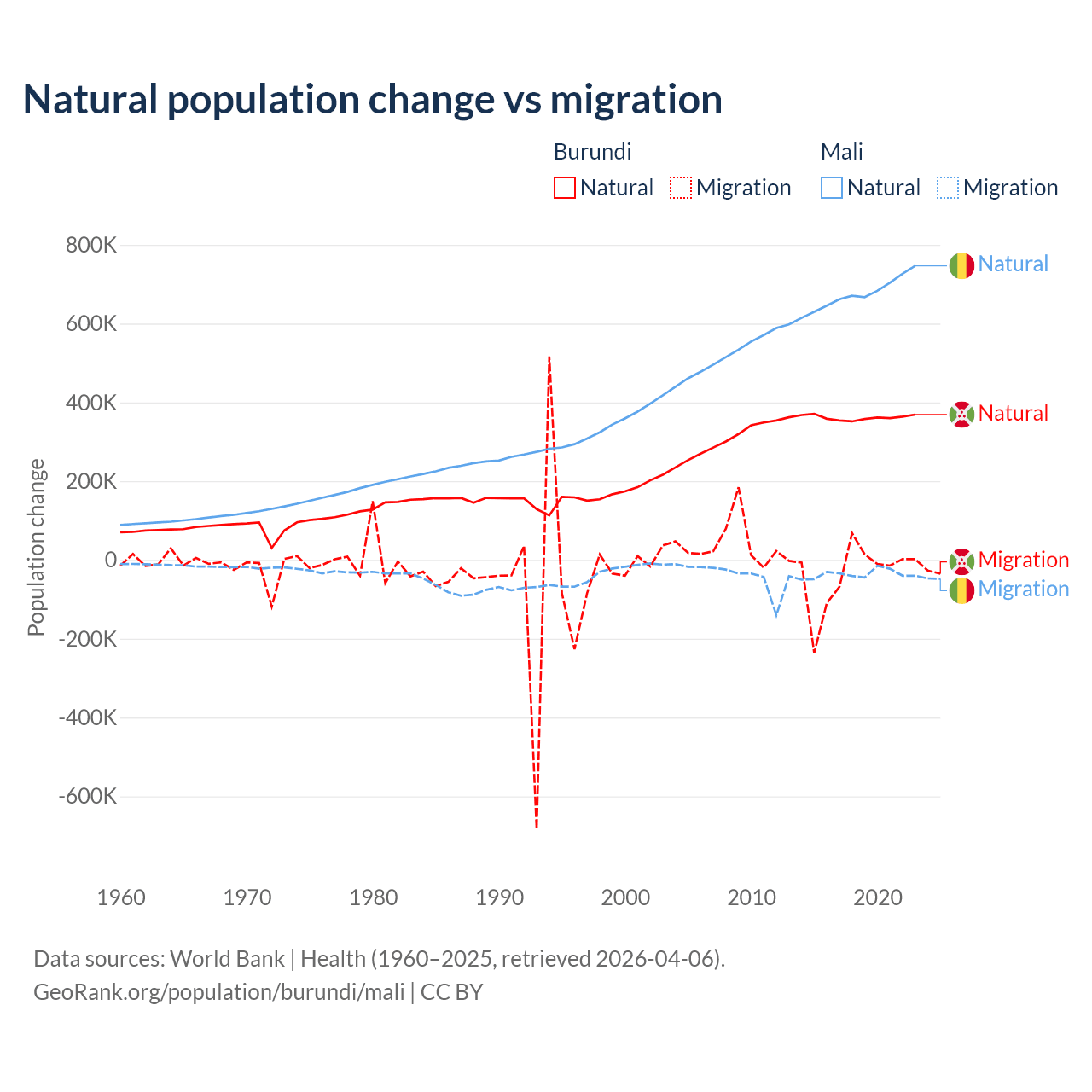 Over the last 10 years, 91% of the population change in Burundi is from natural causes (a gain of 3,614,502 people) and 9.03% is from migration (a loss of 358,928 people). In Mali 94.9% is from natural causes (a gain of 6,749,473 people) and 5.13% is from migration (a loss of 365,292 people).