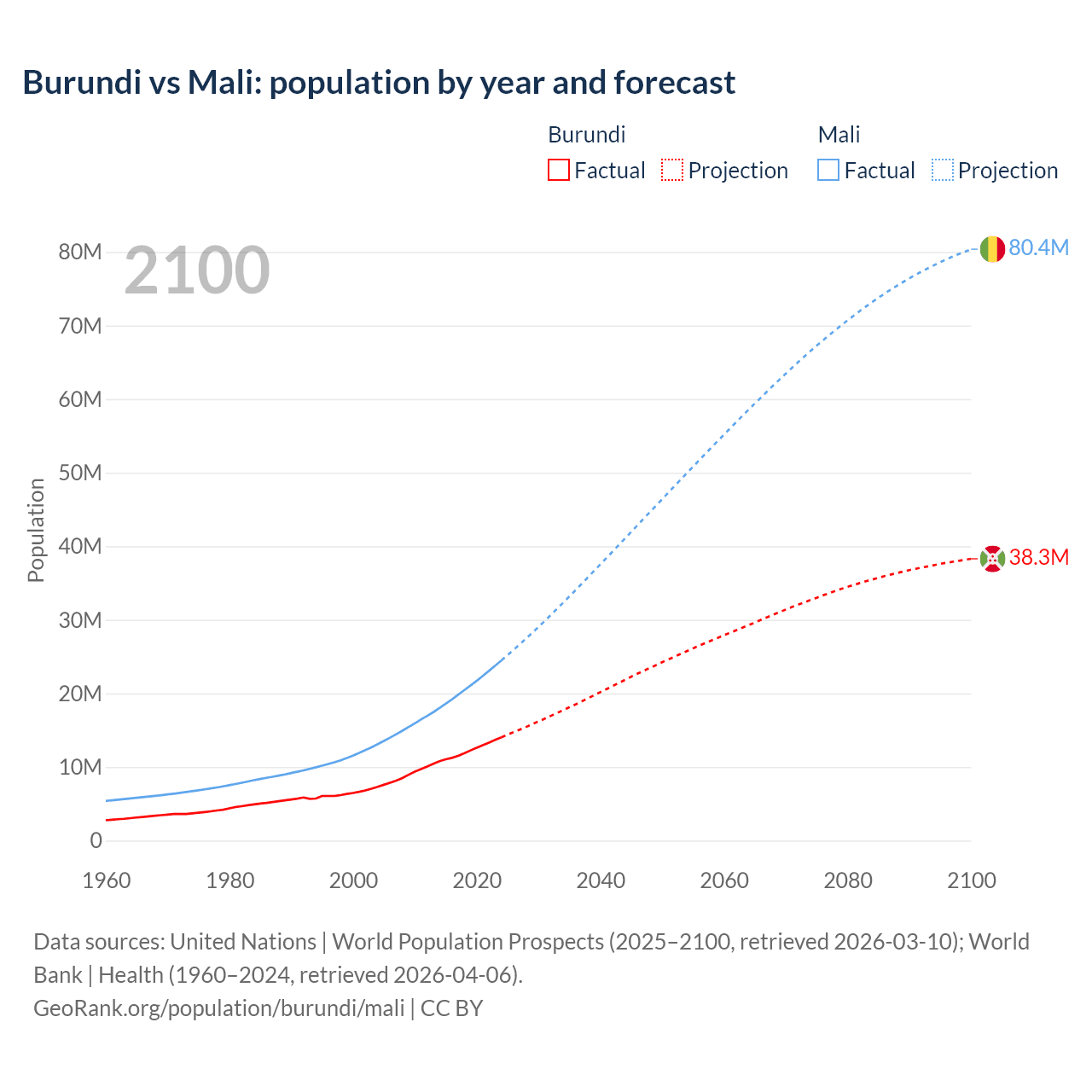 The latest officially reported population of Burundi was 14,047,786 in 2024 vs 24,478,595 people in Mali in 2024. In 2026, based on the adjusted UN estimation, the current Burundi's population is 14,833,763 people compared to 26,143,152 in Mali.