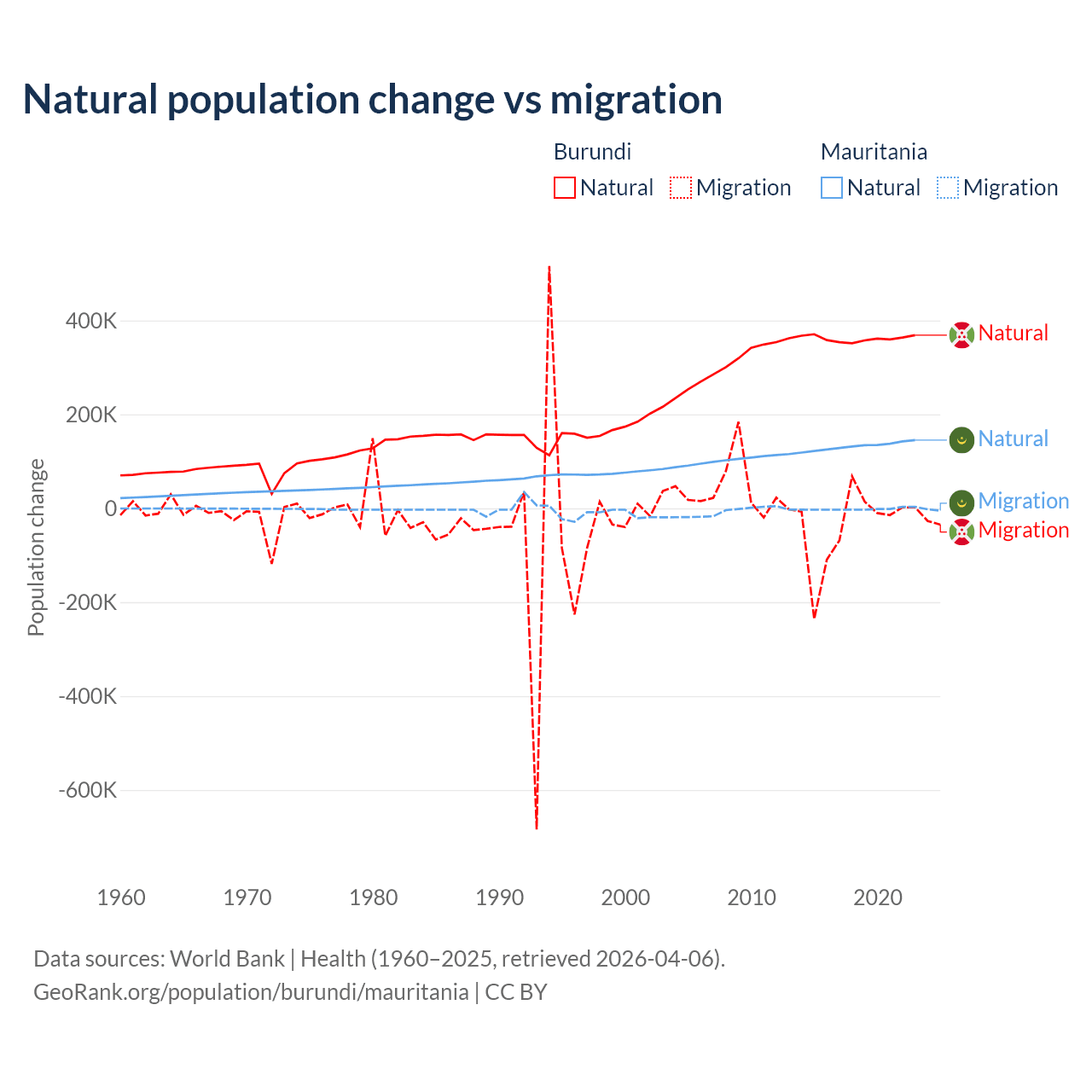 Over the last 10 years, 91% of the population change in Burundi is from natural causes (a gain of 3,614,502 people) and 9.03% is from migration (a loss of 358,928 people). In Mauritania 98.9% is from natural causes (a gain of 1,320,903 people) and 1.12% is from migration (a loss of 14,982 people).