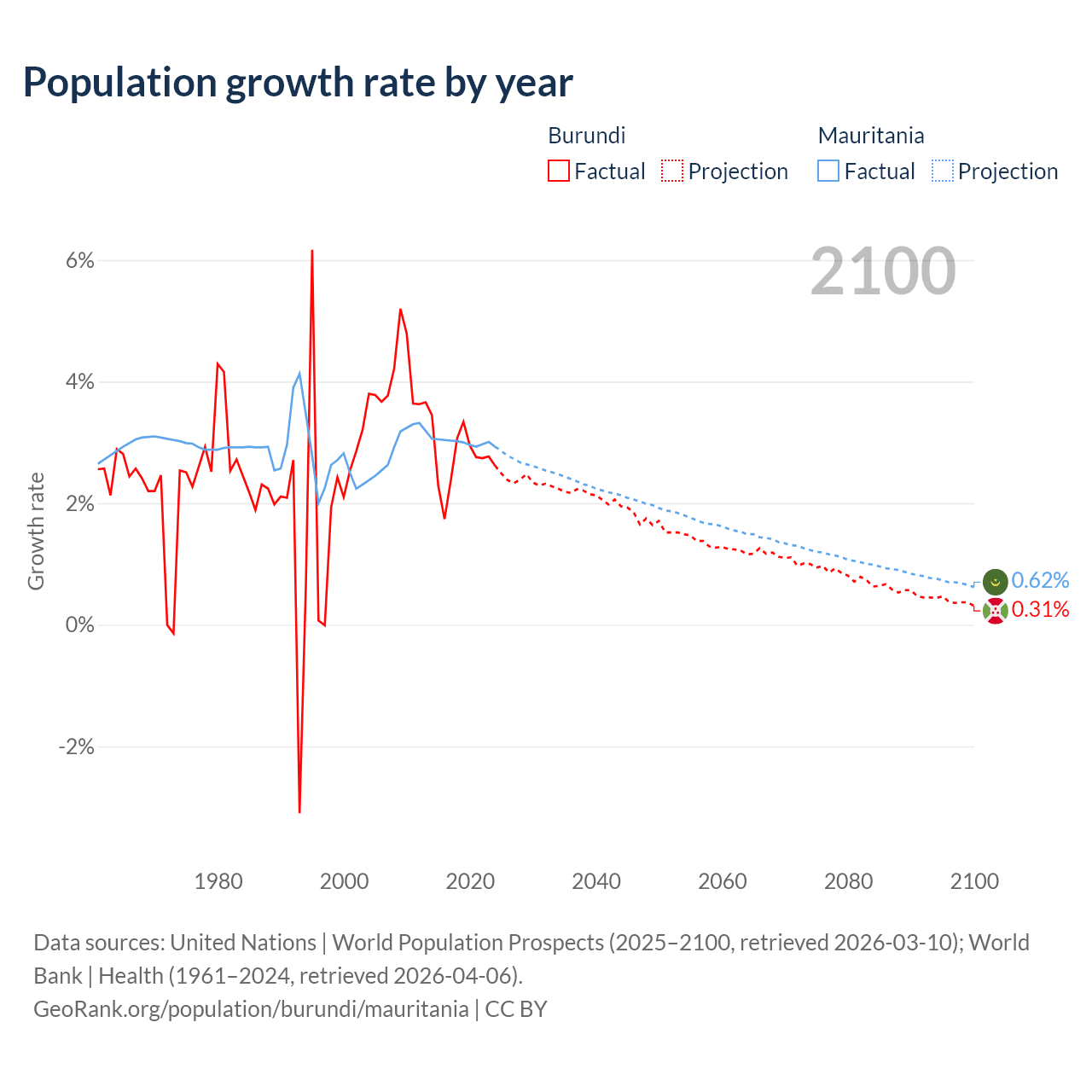 - For the last 10 years, Burundi has had an average growth rate of +2.74% per year vs +3% in Mauritania.