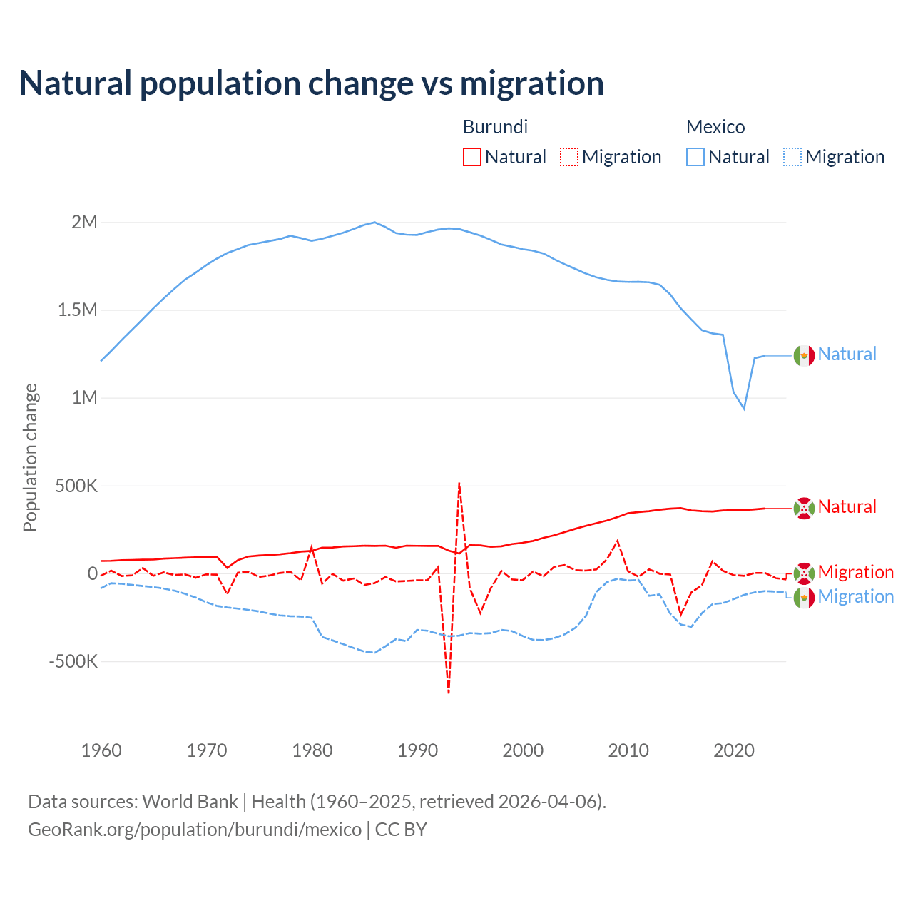 Over the last 10 years, 91% of the population change in Burundi is from natural causes (a gain of 3,614,502 people) and 9.03% is from migration (a loss of 358,928 people). In Mexico 87.5% is from natural causes (a gain of 13,080,136 people) and 12.5% is from migration (a loss of 1,876,544 people).