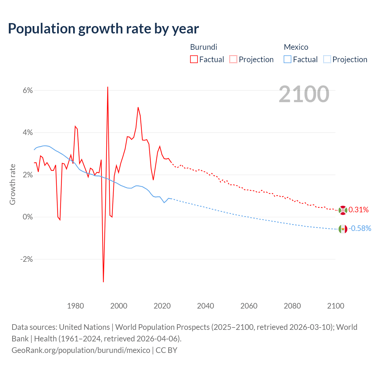 - For the last 10 years, Burundi has had an average growth rate of +2.74% per year vs +0.92% in Mexico.