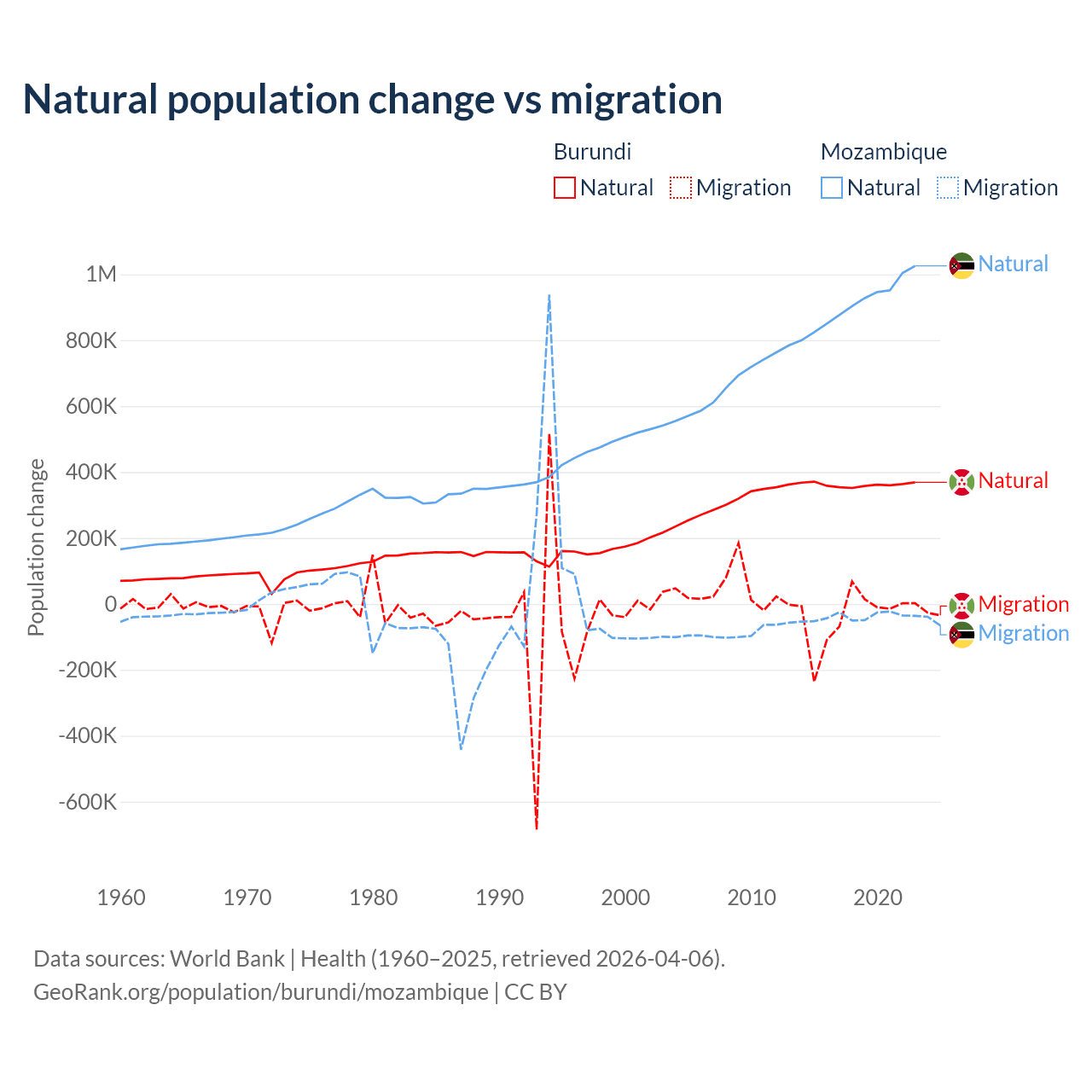 Over the last 10 years, 91% of the population change in Burundi is from natural causes (a gain of 3,614,502 people) and 9.03% is from migration (a loss of 358,928 people). In Mozambique 95.9% is from natural causes (a gain of 9,108,203 people) and 4.15% is from migration (a loss of 393,923 people).