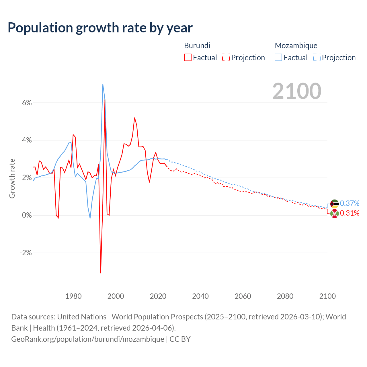 - For the last 10 years, Burundi has had an average growth rate of +2.74% per year vs +2.99% in Mozambique.