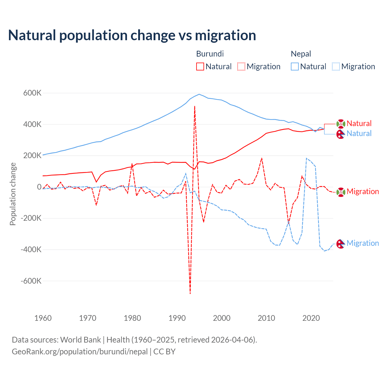 Over the last 10 years, 91% of the population change in Burundi is from natural causes (a gain of 3,614,502 people) and 9.03% is from migration (a loss of 358,928 people). In Nepal 67.9% is from natural causes (a gain of 3,909,749 people) and 32.1% is from migration (a loss of 1,851,664 people).