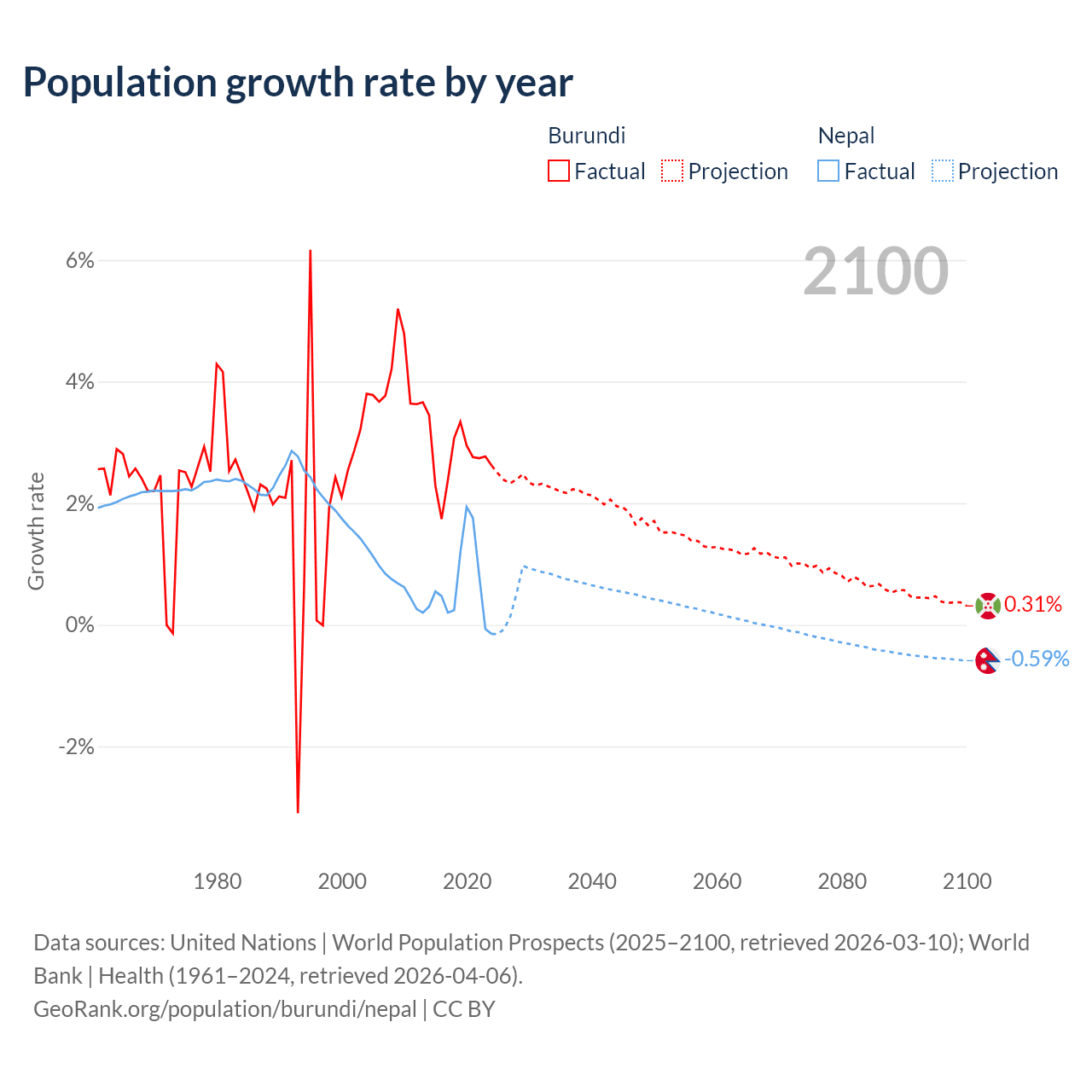 - For the last 10 years, Burundi has had an average growth rate of +2.74% per year vs +0.66% in Nepal.
