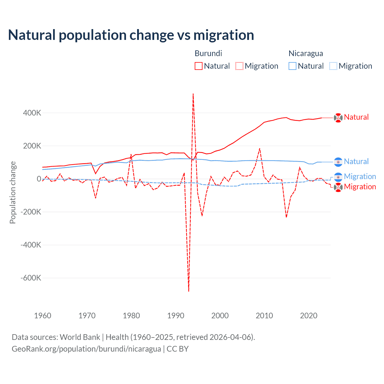 Over the last 10 years, 91% of the population change in Burundi is from natural causes (a gain of 3,614,502 people) and 9.03% is from migration (a loss of 358,928 people). In Nicaragua 85.5% is from natural causes (a gain of 1,017,084 people) and 14.5% is from migration (a loss of 172,078 people).