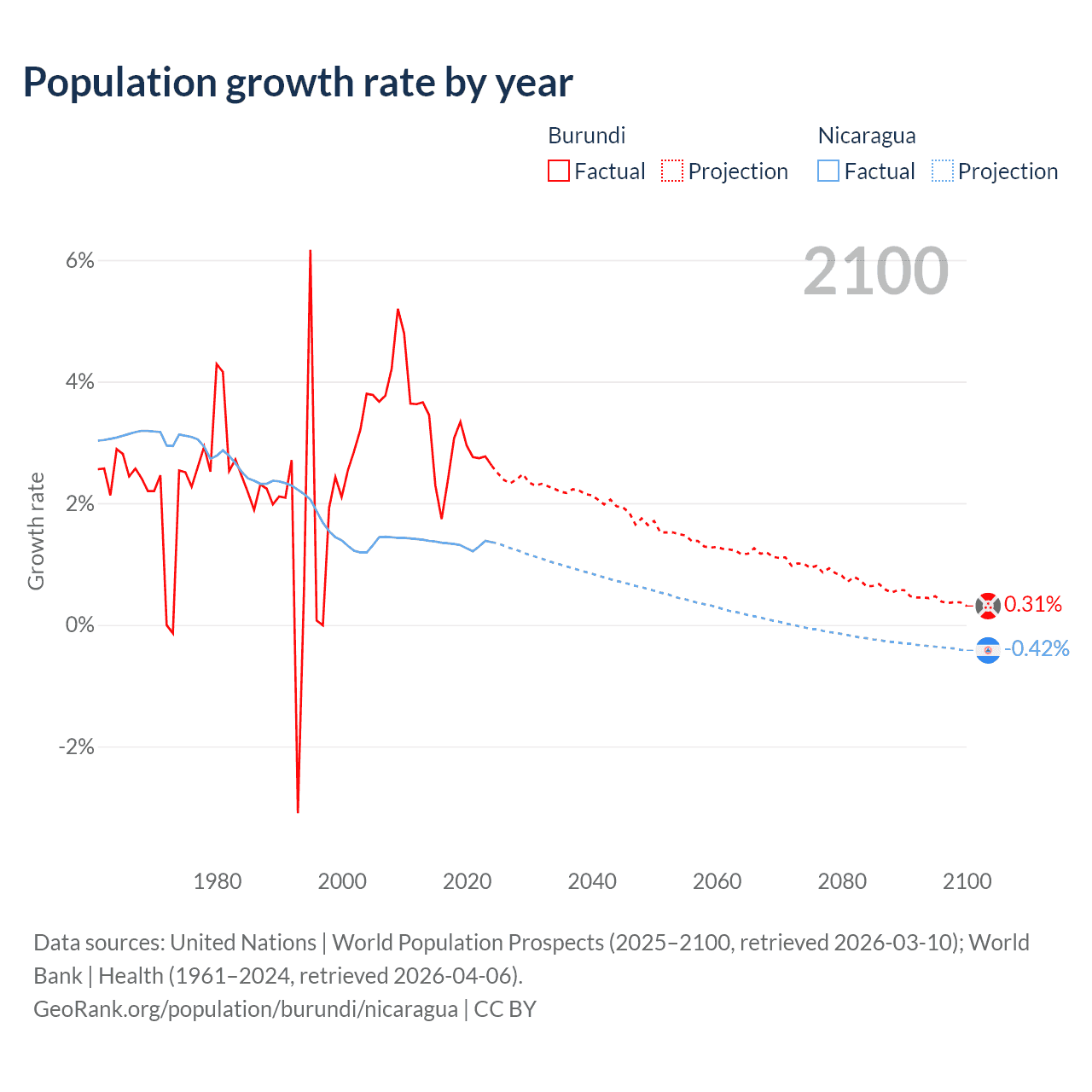- For the last 10 years, Burundi has had an average growth rate of +2.74% per year vs +1.33% in Nicaragua.