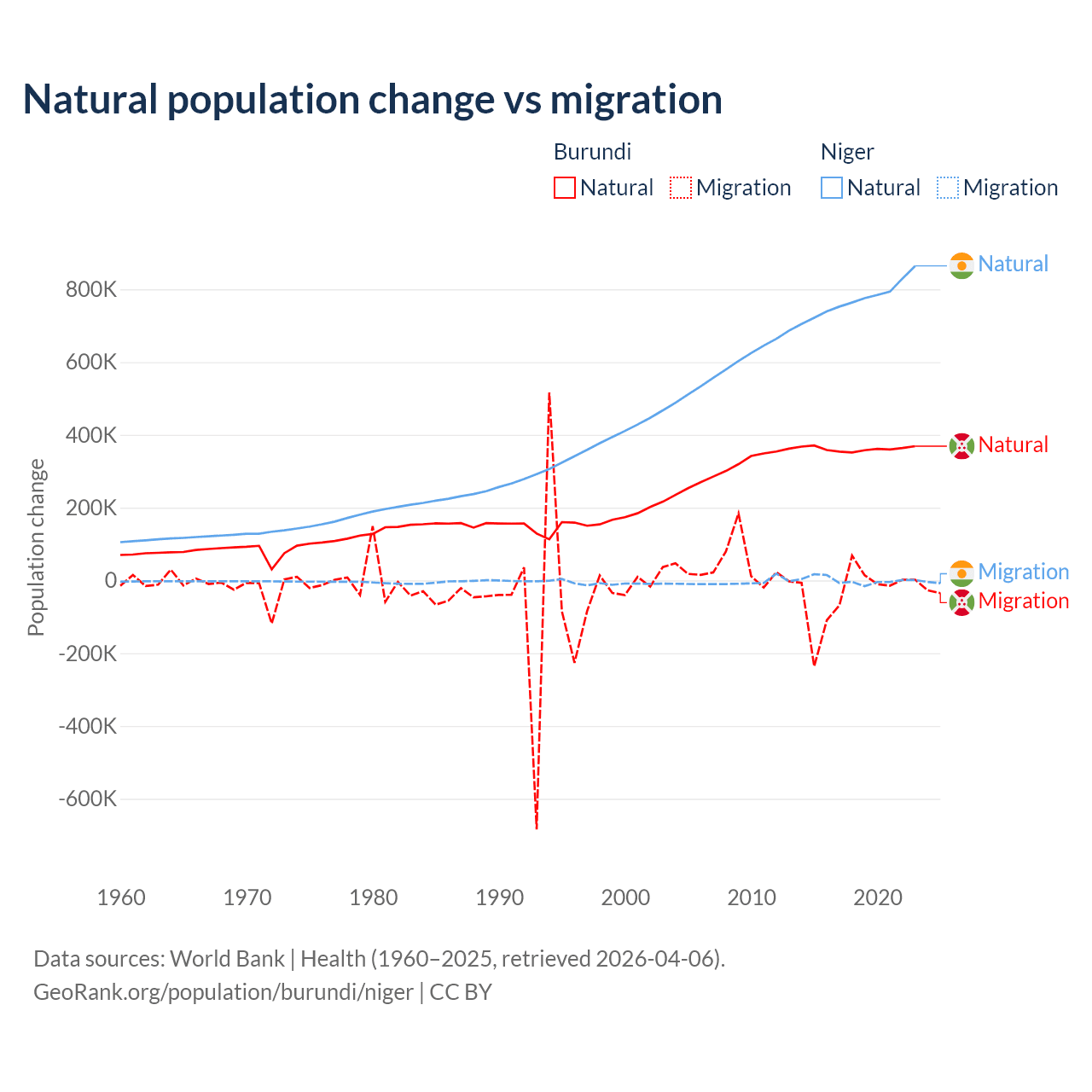 Over the last 10 years, 91% of the population change in Burundi is from natural causes (a gain of 3,614,502 people) and 9.03% is from migration (a loss of 358,928 people). In Niger 100% is from natural causes (a gain of 7,728,287 people) and 0.03% is from migration (a gain of 2,520 people).