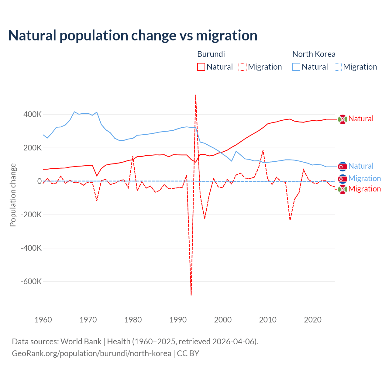 Over the last 10 years, 91% of the population change in Burundi is from natural causes (a gain of 3,614,502 people) and 9.03% is from migration (a loss of 358,928 people). In North Korea 97.7% is from natural causes (a gain of 1,097,372 people) and 2.33% is from migration (a loss of 26,227 people).