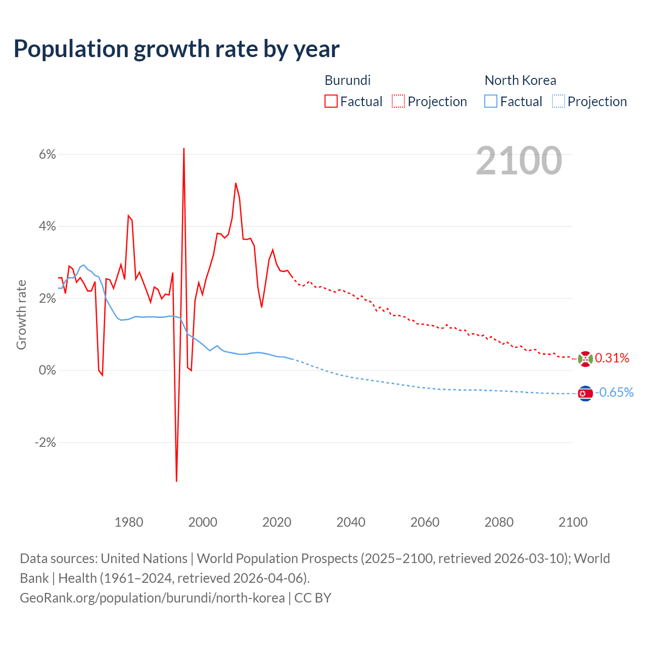 - For the last 10 years, Burundi has had an average growth rate of +2.74% per year vs +0.41% in North Korea.
