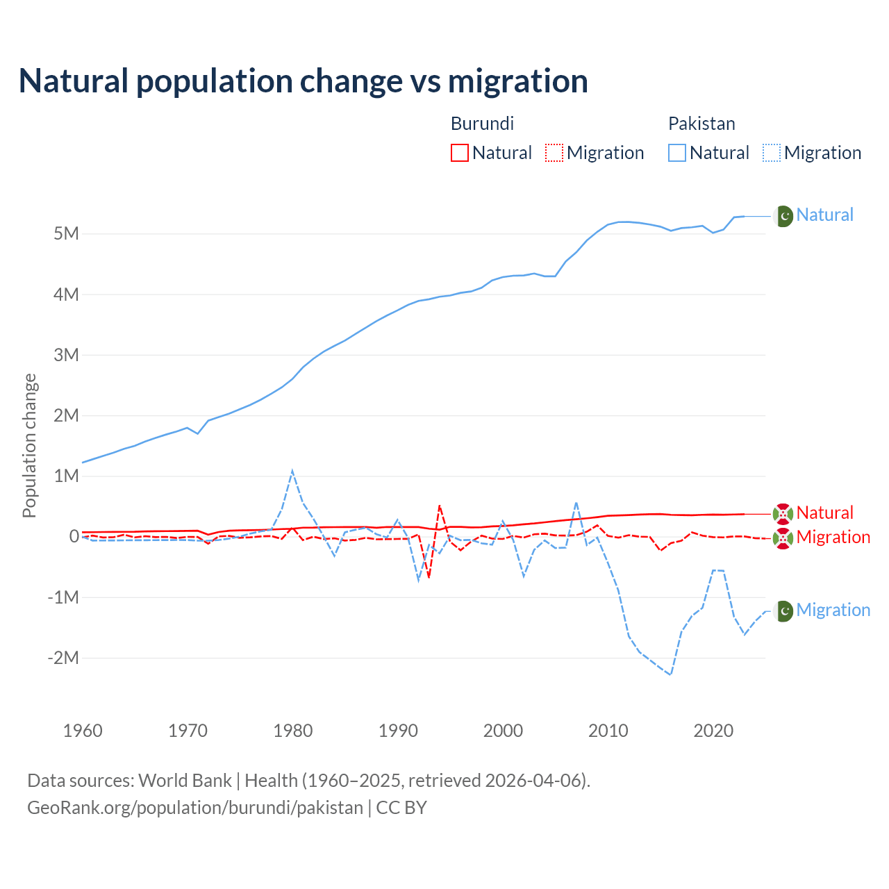 Over the last 10 years, 91% of the population change in Burundi is from natural causes (a gain of 3,614,502 people) and 9.03% is from migration (a loss of 358,928 people). In Pakistan 77.8% is from natural causes (a gain of 51,255,404 people) and 22.2% is from migration (a loss of 14,629,055 people).