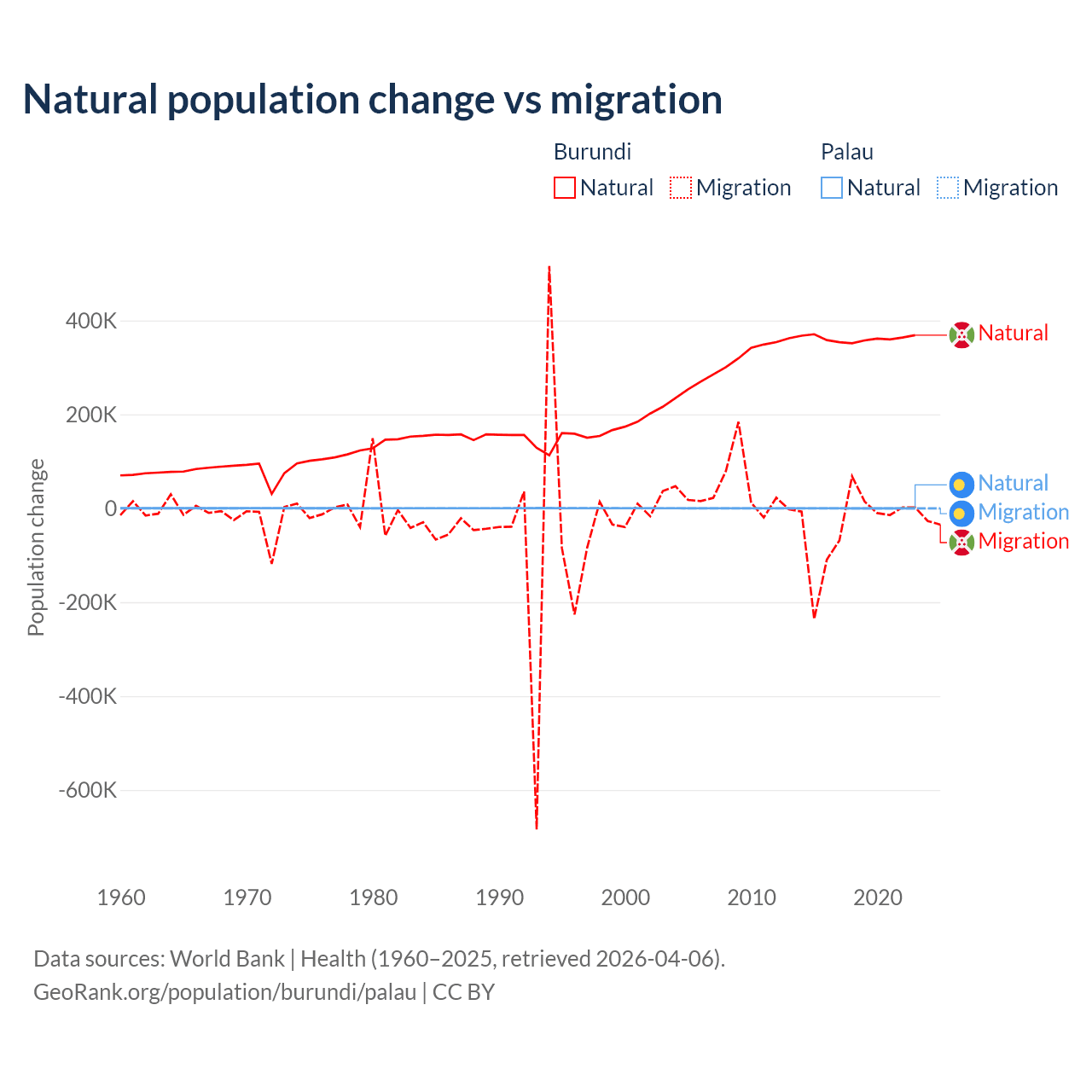 Over the last 10 years, 91% of the population change in Burundi is from natural causes (a gain of 3,614,502 people) and 9.03% is from migration (a loss of 358,928 people). In Palau 53.8% is from natural causes (a gain of 264 people) and 46.2% is from migration (a loss of 227 people).