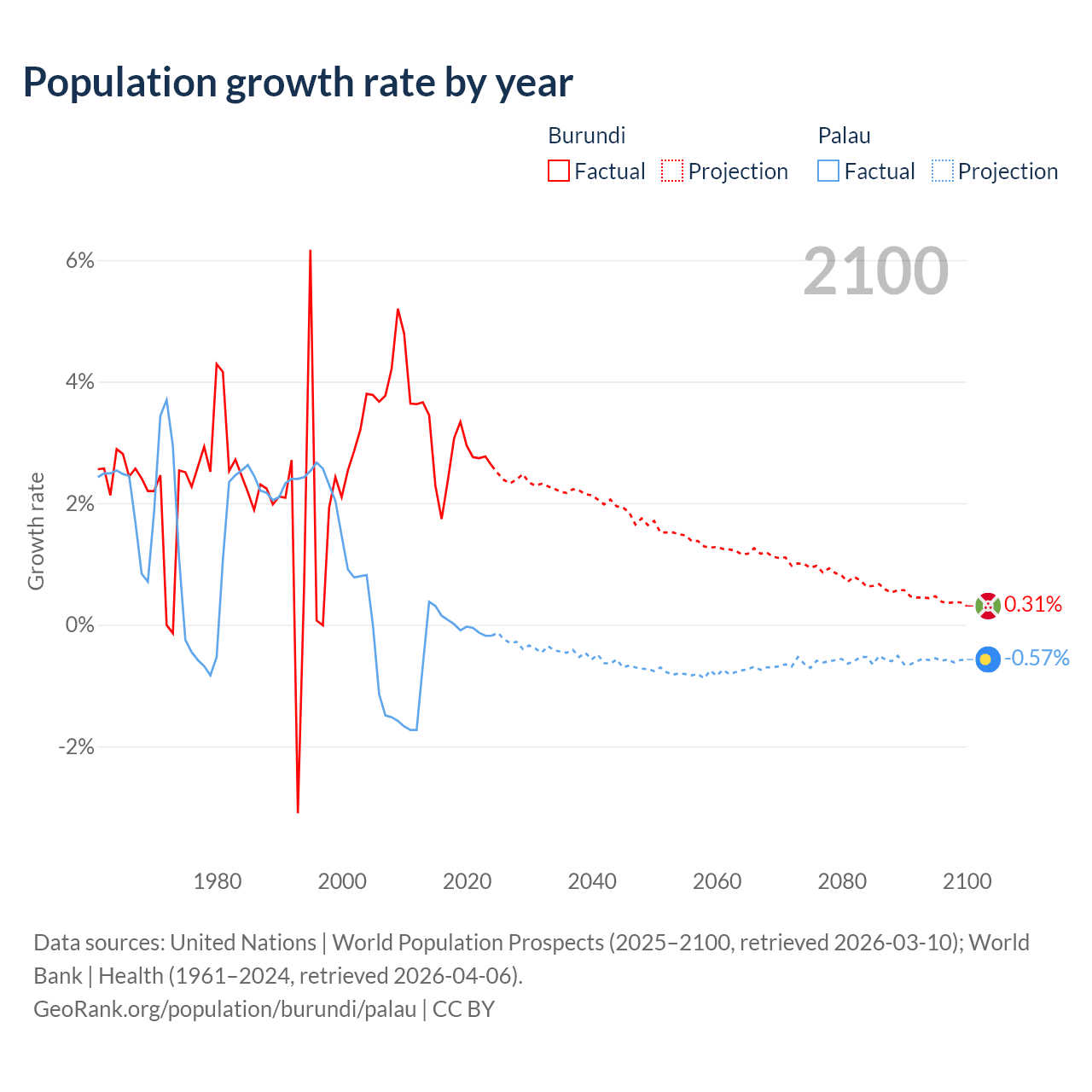 - For the last 10 years, Burundi has had an average growth rate of +2.74% per year vs +0.02% in Palau.