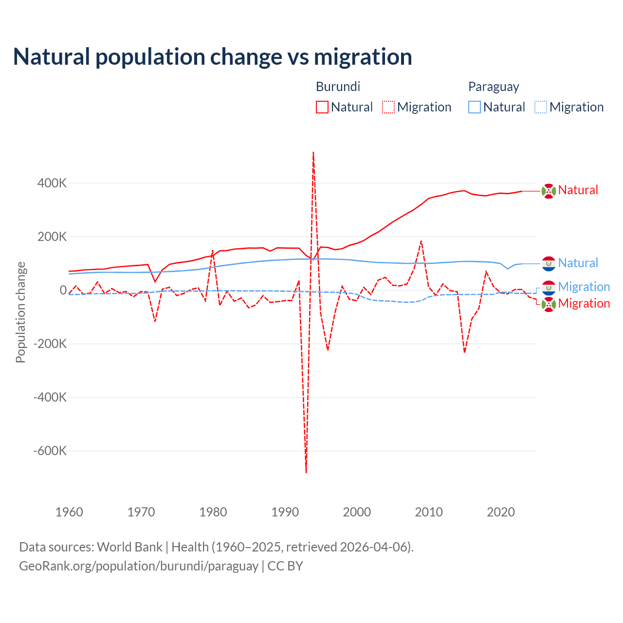Over the last 10 years, 91% of the population change in Burundi is from natural causes (a gain of 3,614,502 people) and 9.03% is from migration (a loss of 358,928 people). In Paraguay 87.6% is from natural causes (a gain of 1,002,636 people) and 12.4% is from migration (a loss of 141,377 people).