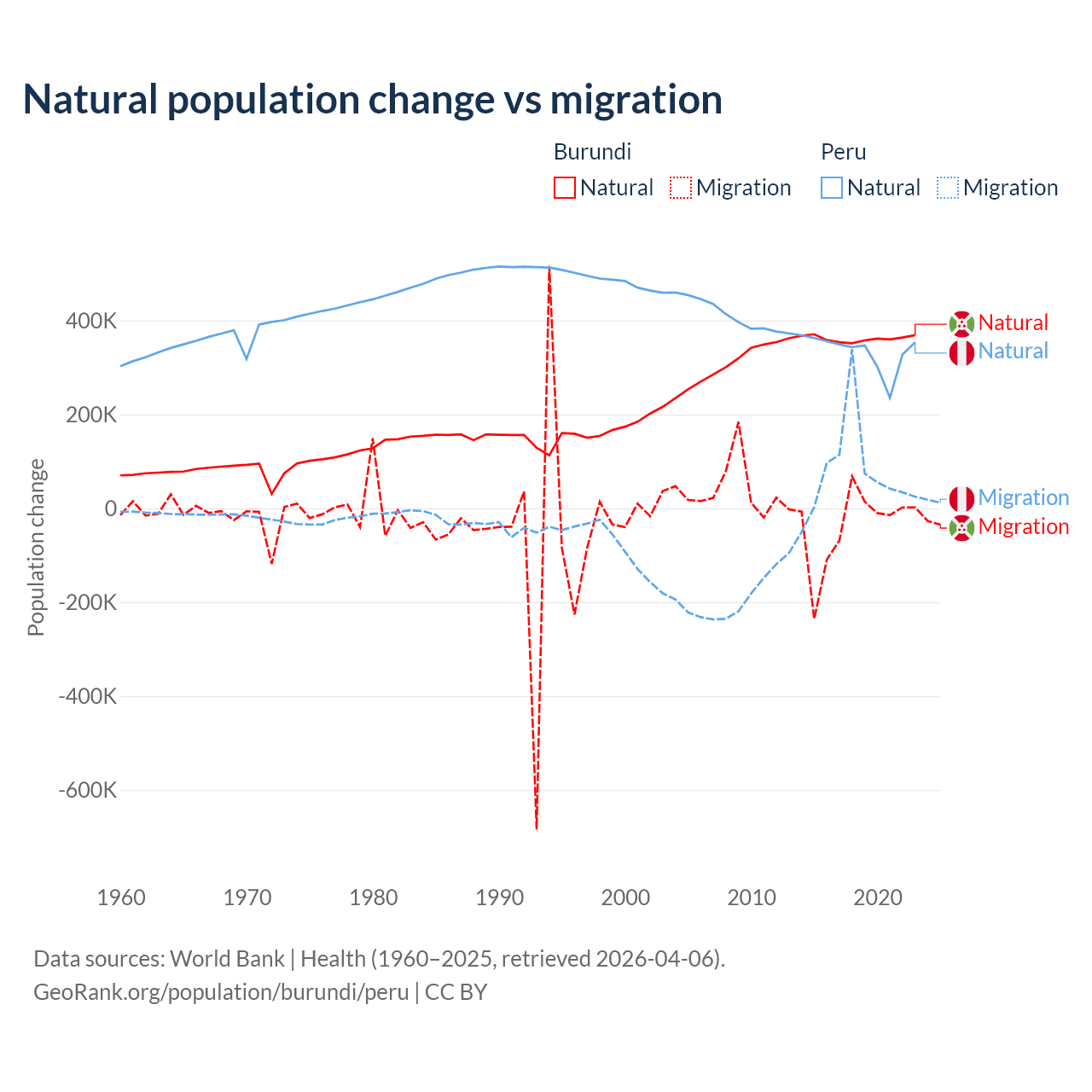 Over the last 10 years, 91% of the population change in Burundi is from natural causes (a gain of 3,614,502 people) and 9.03% is from migration (a loss of 358,928 people). In Peru 82% is from natural causes (a gain of 3,345,822 people) and 18% is from migration (a gain of 732,505 people).